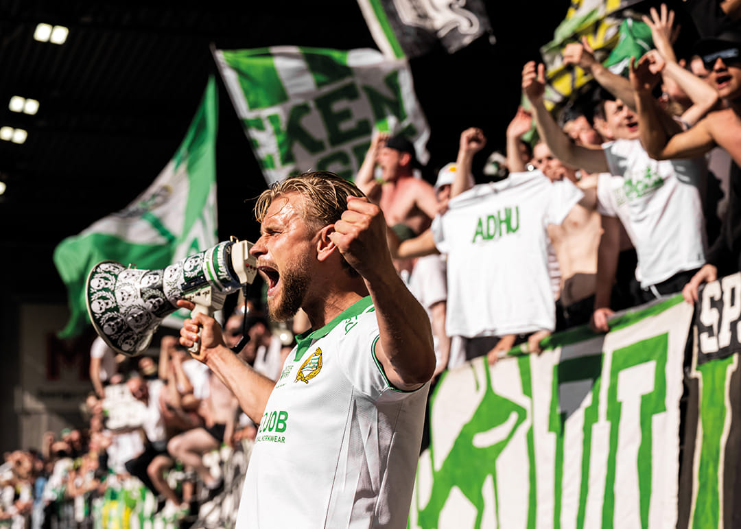 Hammarbys Simon Strand jublar framför sina supportrar efter fotbollsmatchen i Allsvenskan mellan Elfsborg och Hammarby den 31 maj 2025 i Borås.