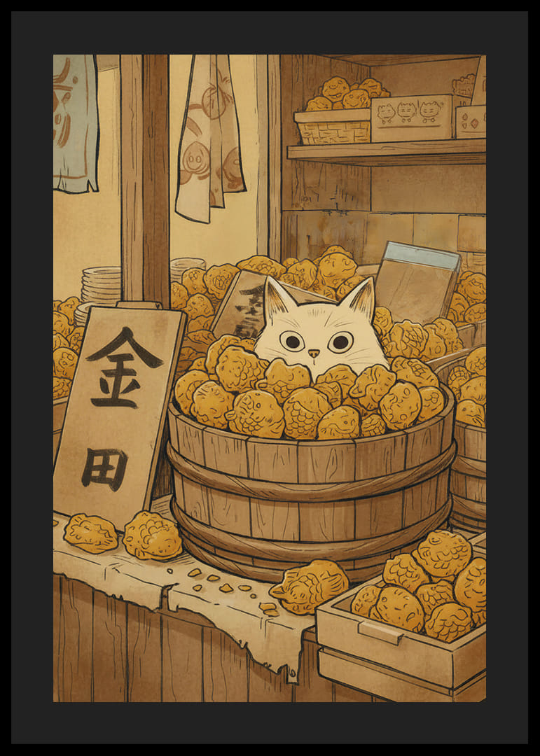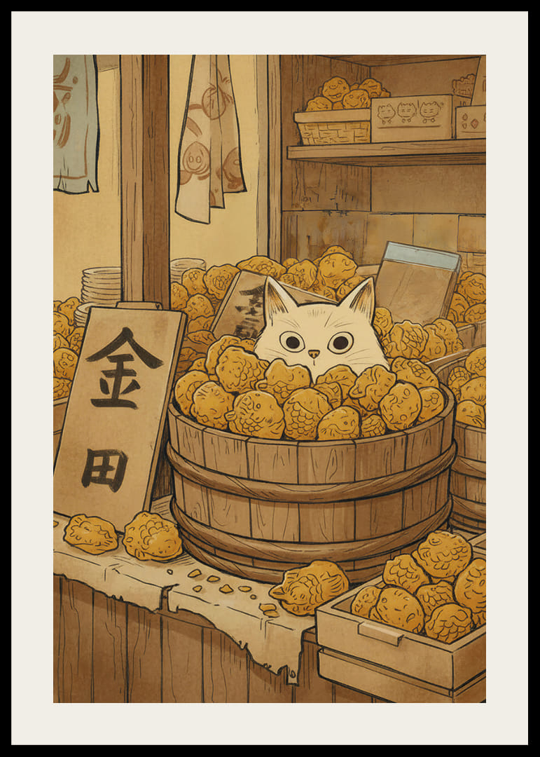Denna poster fångar ögat direkt med en mystisk katt som kikar fram bland en hög av gyllene frukter. Den kontrasterande vita katten och de varma, dämpade tonerna skapar en lekfull och överraskande känsla. Den förmedlar en känsla av nyfikenhet och glädje, vilket gör den perfekt för att höja stämningen och tillföra charm och karaktär till vilket rum som helst.