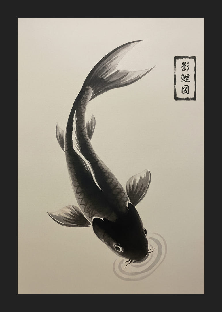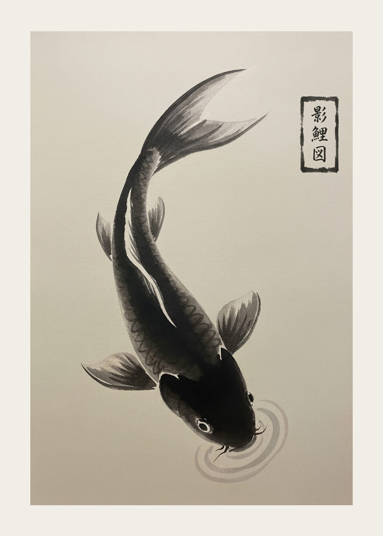 Denna poster fångar en elegant koi i sin stillsamma vandring över vattnets yta. Den svartvita färgskalan betonar fiskens mjuka rörelser, vilket skapar en känsla av stillhet och balans. I varje penseldrag känner man den traditionella konstens tidlöshet som ger ett lugn till alla rum. Postern förvandlar rummet till en fristad, där varje blick bjuder in till meditation och reflektion.