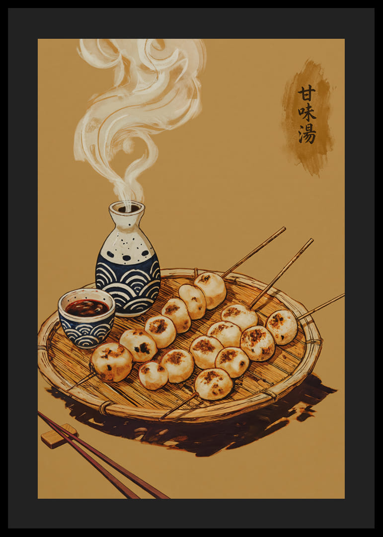 Denna poster fångar omedelbart uppmärksamheten med sina ångande delikatesser av gyllene stekta bollar och en traditionell tekanna. Ångans virvlar förstärker känslan av hemtrevnad och kultur. De harmoniska bruna och beige tonerna ger en varm atmosfär som förhöjer alla kök eller matsalar. Posterns konstnärliga design lockar till både ro och aptit, vilket gör den till en perfekt dekorativ mittpunkt.