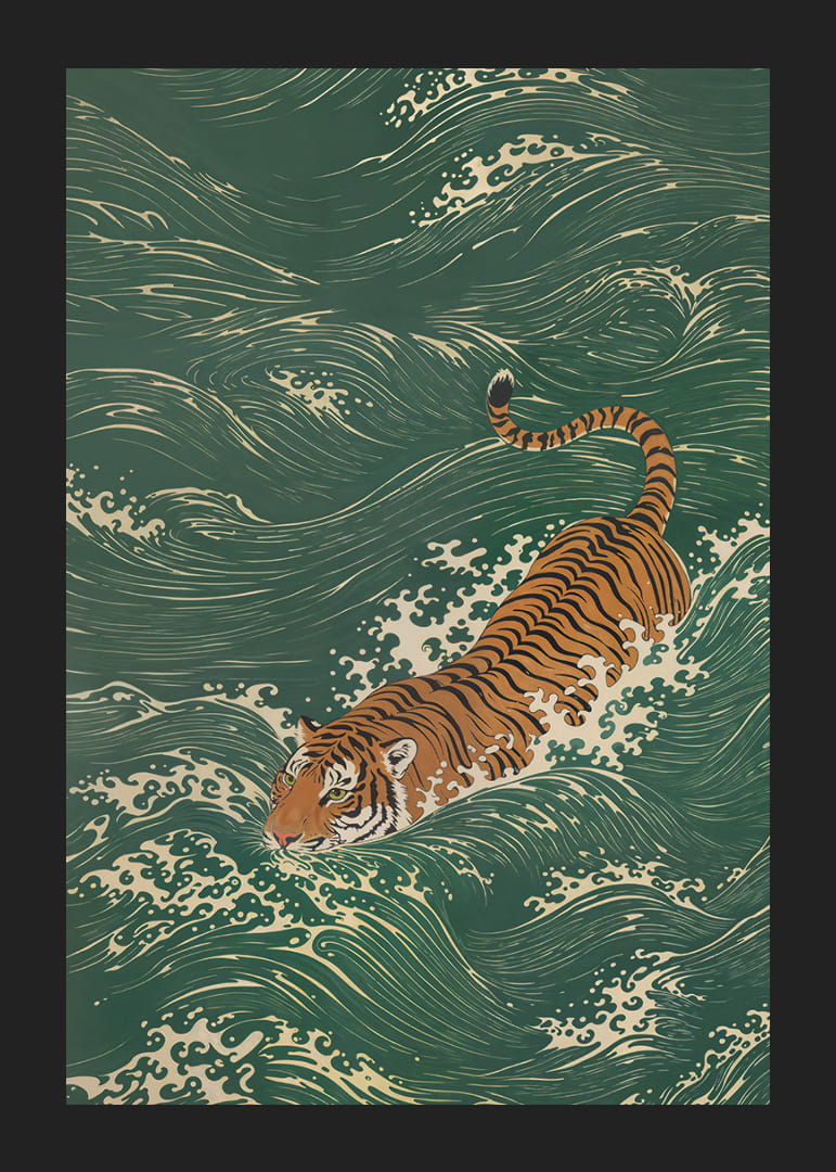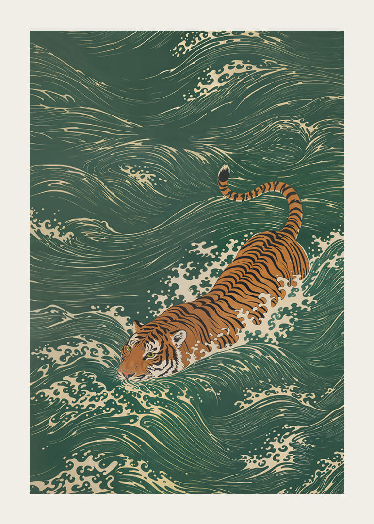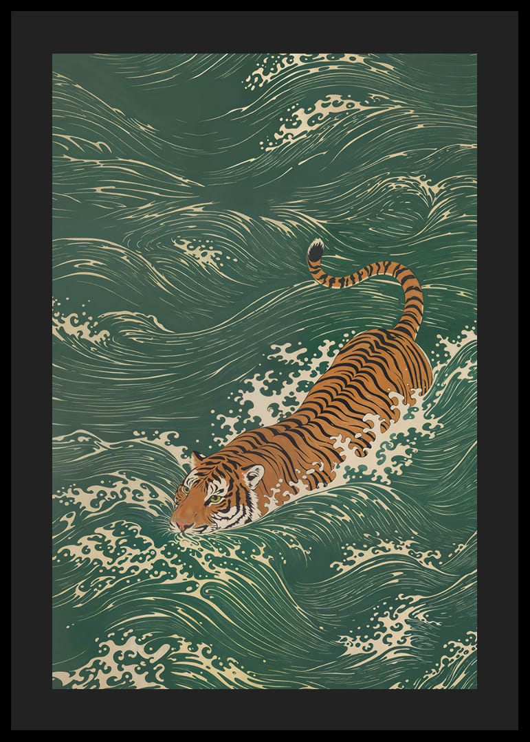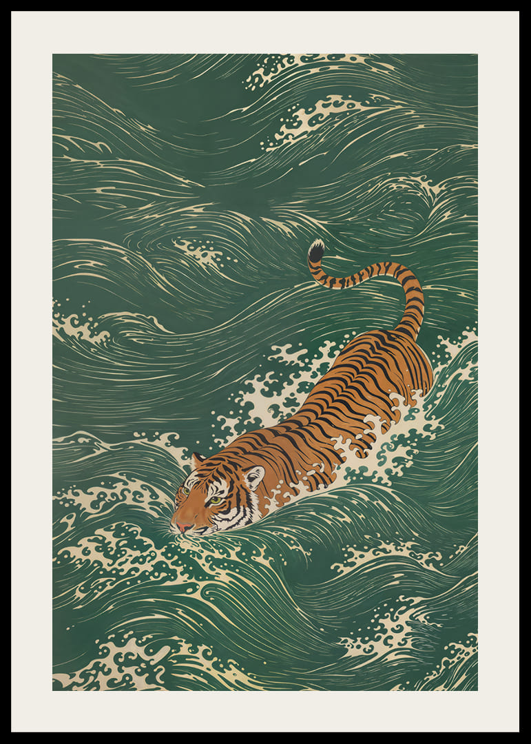Denna poster fångar en tiger som graciöst bryter genom böljande gröna vågor, vilket skapar en känsla av elegant styrka. Det livfulla samspelet mellan rovdjurets djärva ränder och havets mjuka former framhäver en fantastisk harmoni. Perfekt för att tillföra en touch av vild skönhet och dynamik, ger denna poster vilket rum som helst en känsla av både ro och styrka.