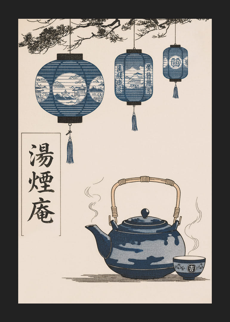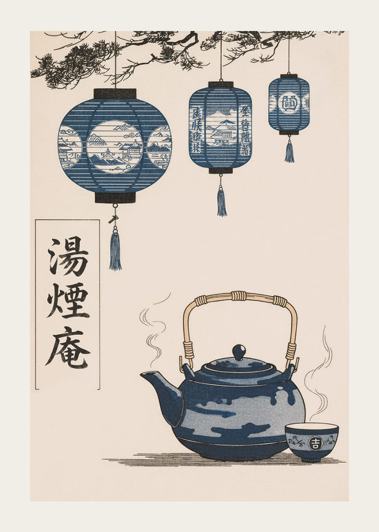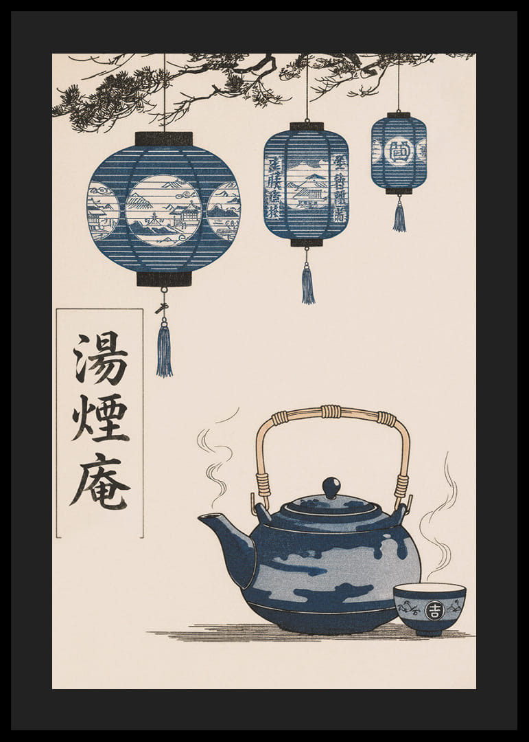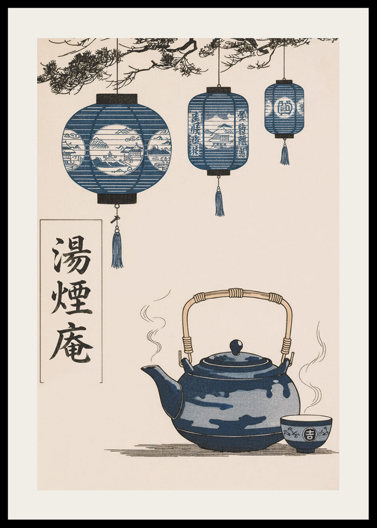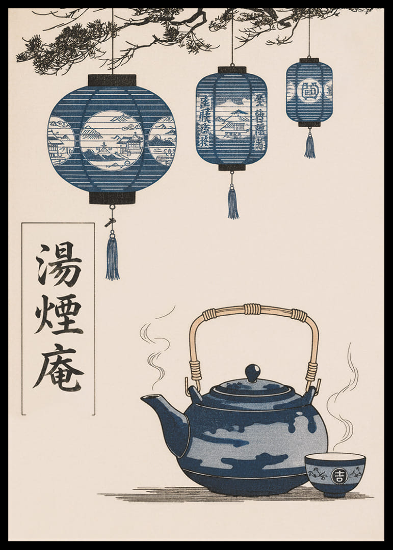 Denna poster fångar ögat med sina harmoniska blå toner och en känsla av stillhet. De eleganta lanternorna hänger graciöst över en vacker tekanna, ångande av värme. Affischen skapar en känsla av tidlös skönhet och orientalisk charm. Denna poster tillför en lugnande och sofistikerad atmosfär till vilket rum som helst, perfekt för att skapa en fridfull och inspirerande miljö.