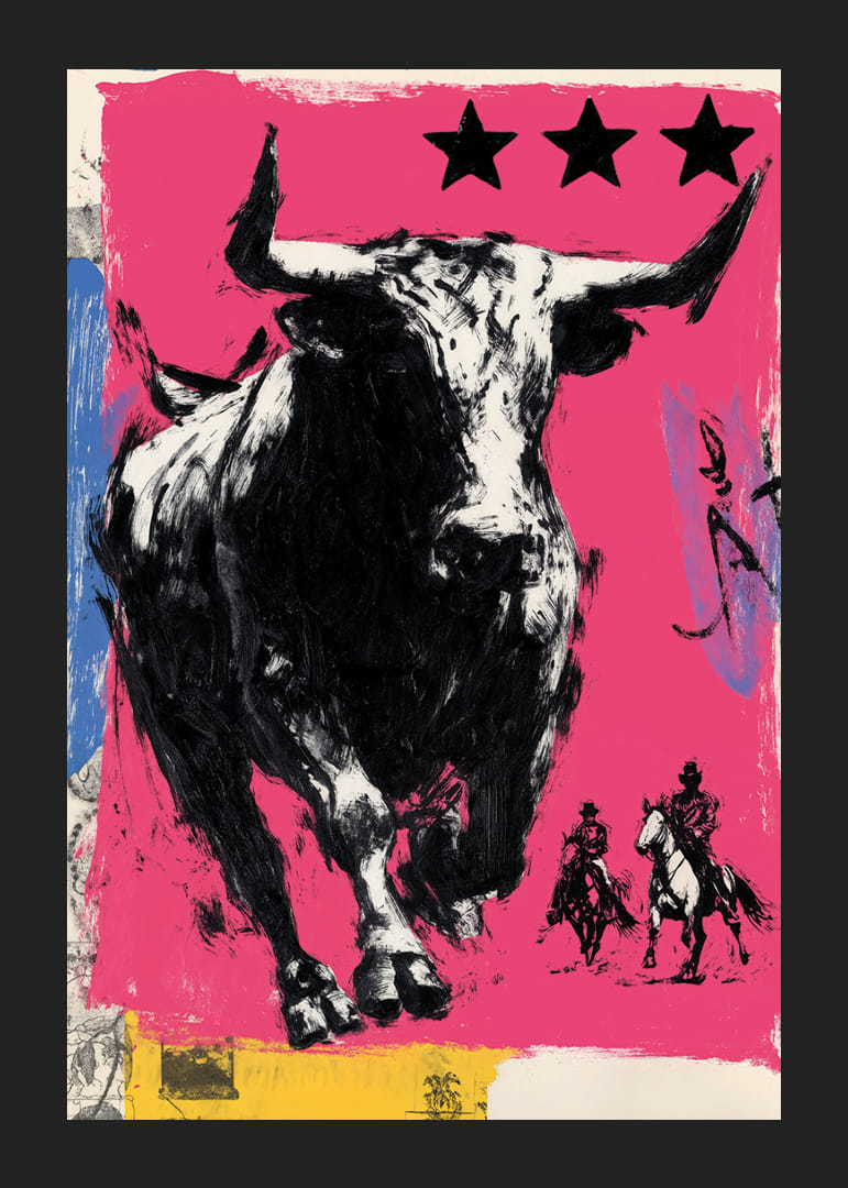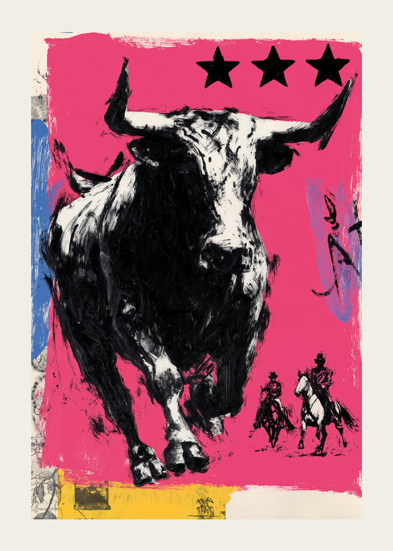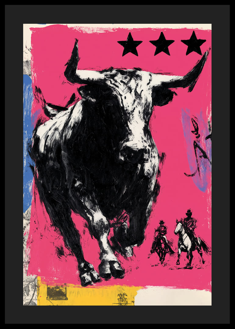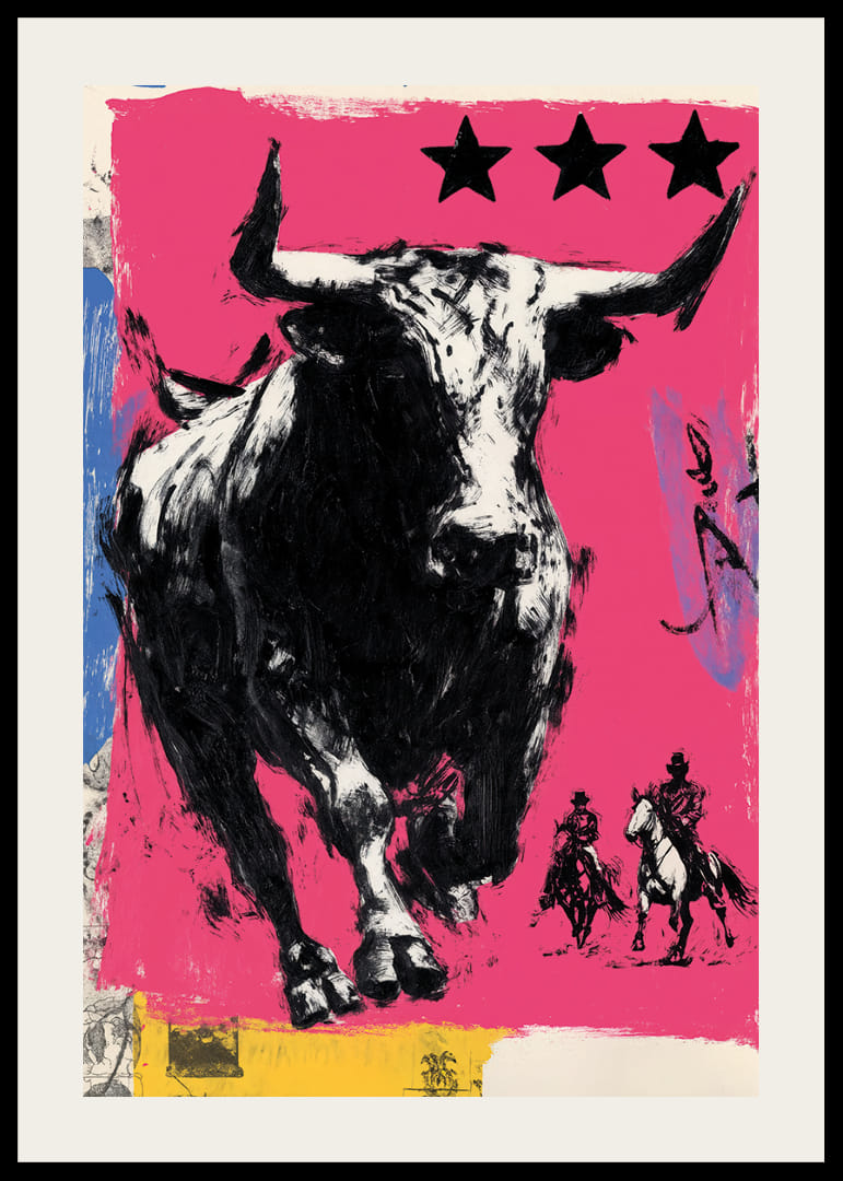 Denna poster fångar en kraftfull tjur i full fart mot en livfull rosa bakgrund, omgiven av konstnärliga stänk och djärva stjärnor. Med sin energiska rörelse och intensiva närvaro skapar postern en dramatisk känsla av frihet och styrka. Detaljerna med ryttare och den konstnärliga texturen förhöjer dess unika charm. En perfekt poster för att tillföra dynamik och kraft till vilken modern inredning som helst.