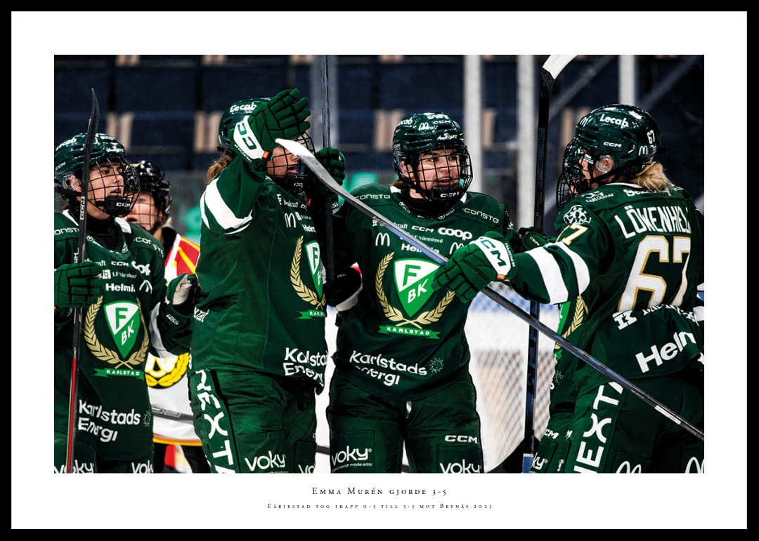 Färjestads Emma Murén jublar med lagkamrater efter 3-5 målet under ishockeymatchen i SDHL mellan Färjestad och Brynäs den 12 oktober 2025 i Karlstad.