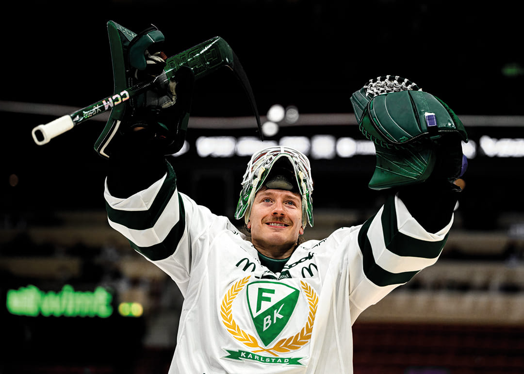 Färjestads målvakt Emil Larmi jublar efter ishockeymatchen i SHL mellan Brynäs och Färjestad den 25 oktober 2025 i Gävle.