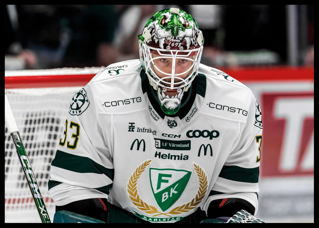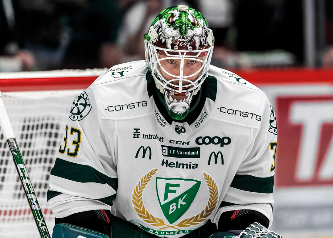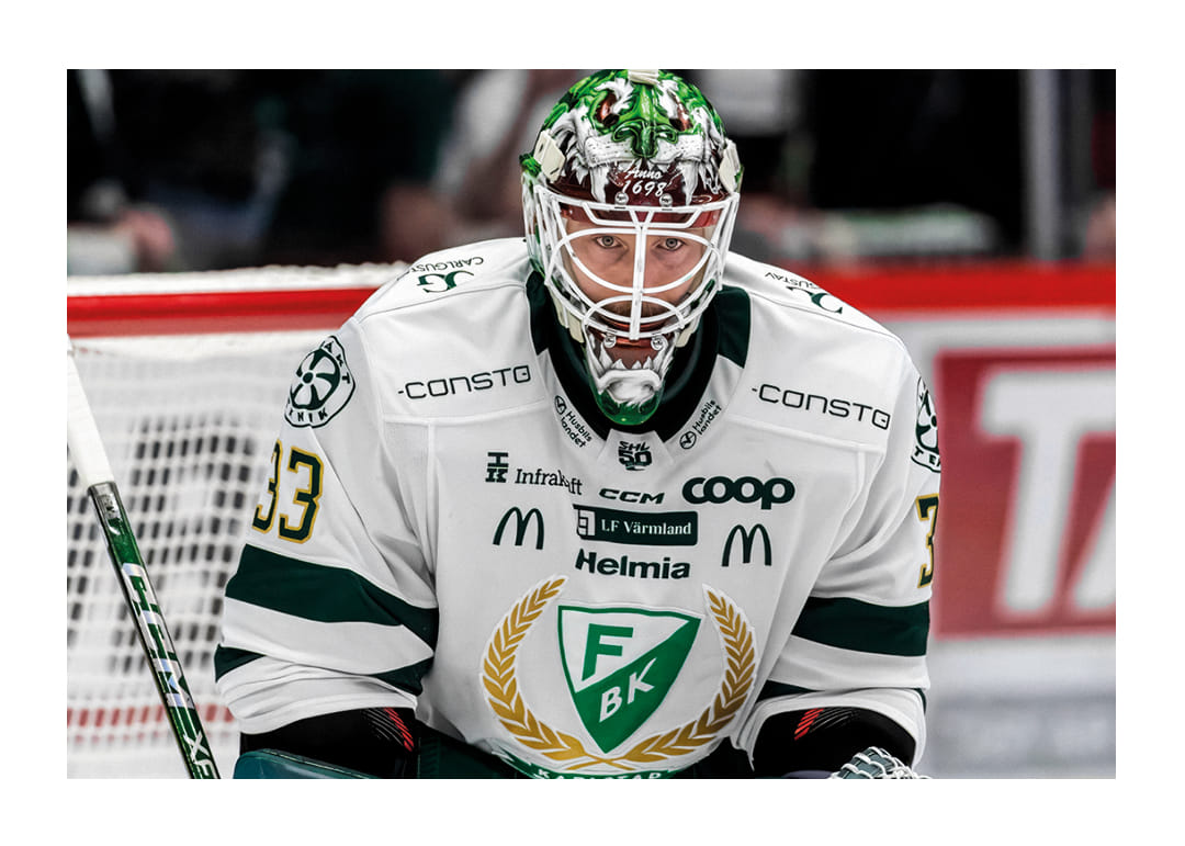 Färjestads målvakt Emil Larmi under ishockeymatchen i SHL mellan Örebro och Färjestad den 4 december 2025 i Örebro.