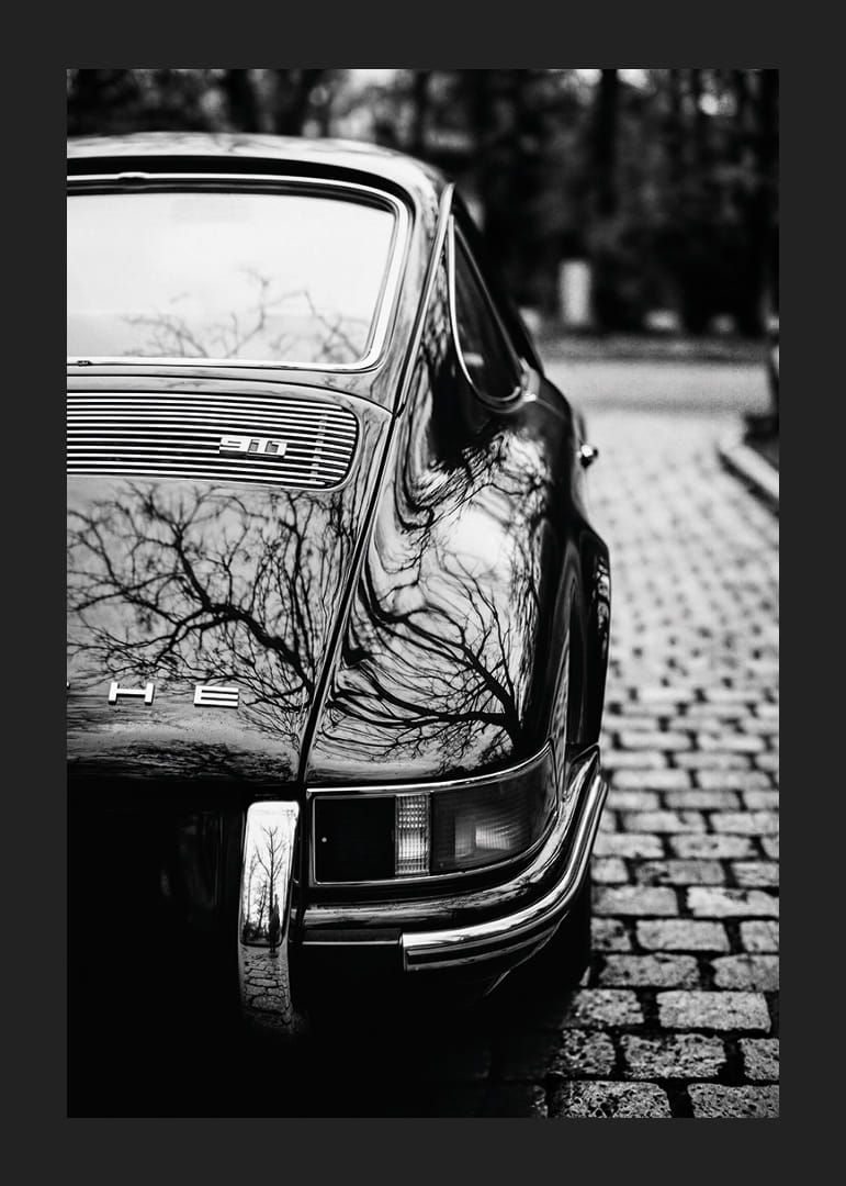 Denna poster fångar den tidlösa elegansen hos en Porsche 911 parkerad längs en kullerstensgata. Bilens glänsande yta speglar de omgivande träden och skapar en nostalgisk, nästan drömlik atmosfär. Med sitt djupa svarta skimmer och sina välbalanserade detaljer lyfter motivet fram Porsche 911:ans ikoniska design och klassiska linjer. Perfekt för att ge rummet en känsla av sofistikation och historiskt arv – en poster som utstrålar stil, tradition och tidlös bilkultur.