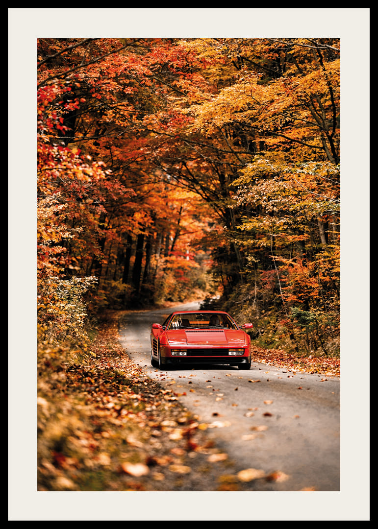 Denna hänförande poster fångar en röd Ferrari Testarossa som elegant glider fram genom en skog klädd i höstens praktfulla färger. De glödande röda och orangea löven skapar en varm och nostalgisk atmosfär som förstärker bilens ikoniska och kraftfulla design. Kombinationen av naturens stillhet och Testarossans tidlösa elegans ger motivet en känsla av frihet och äventyr. En poster som förvandlar rummet till en inspirerande plats där lyx och natur möts i perfekt harmoni.