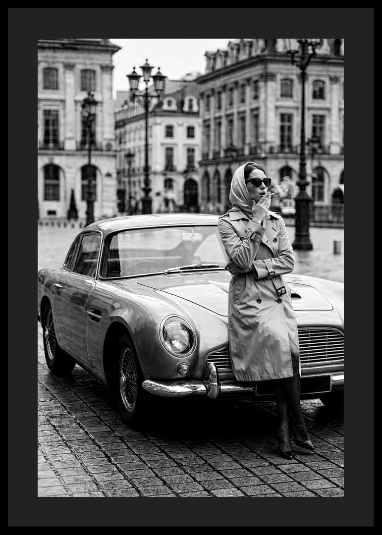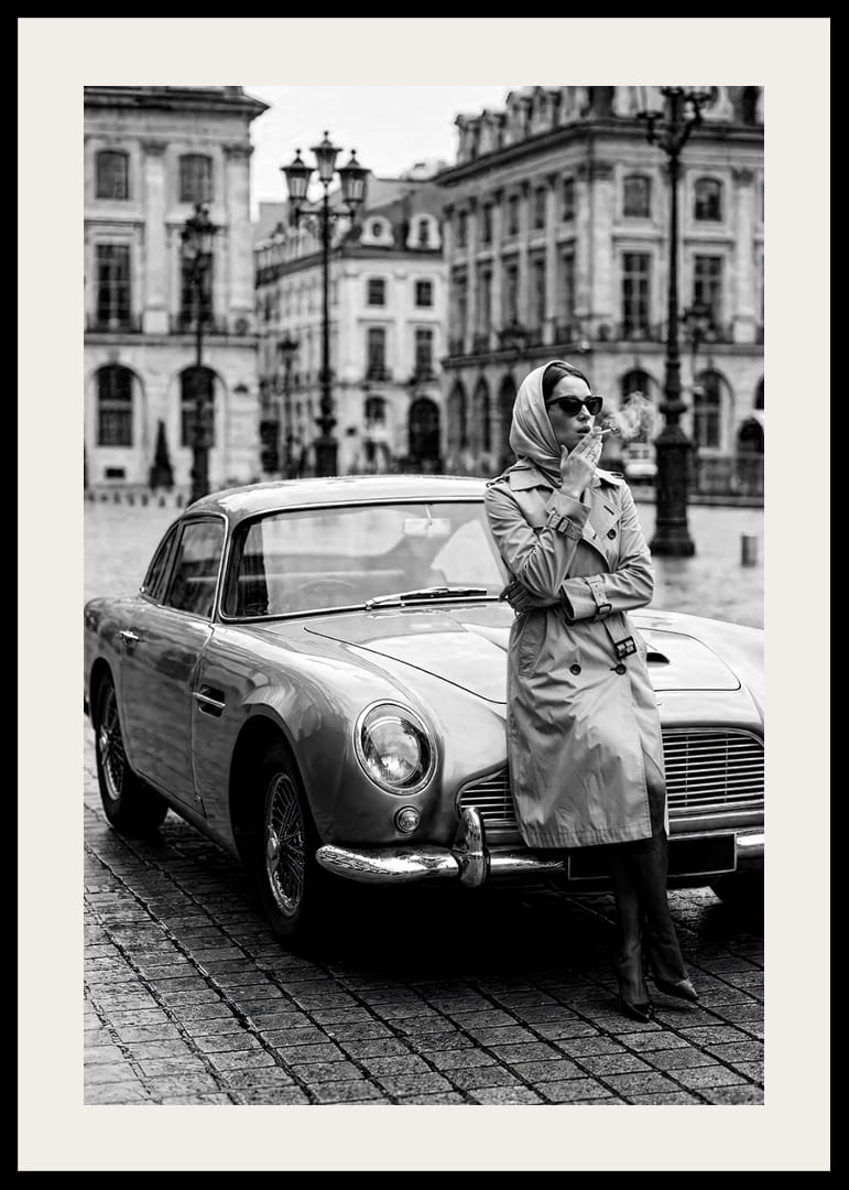 Denna affisch fångar en tidlös känsla av retroelegans med en Aston Martin DB5 som självklar mittpunkt. En kvinna i klassisk trenchcoat lutar sig mot den ikoniska bilen och skapar en atmosfär av sofistikerad nostalgi och stil. De pampiga byggnaderna i bakgrunden förstärker motivets klassiska uttryck och ger scenen en filmisk känsla. En poster som tillför rummet både historia och exklusiv charm, och som garanterat drar till sig blickar.