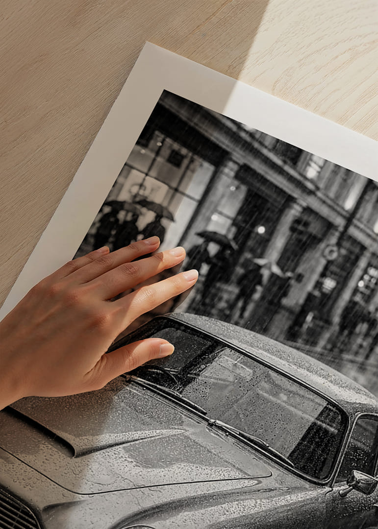 Tidlös charm och elegans möts i denna poster där en Aston Martin DB5 står i ett regnigt stadslandskap. Det svartvita motivet framhäver bilens klassiska detaljer och skapar en stämningsfull känsla av nostalgi och filmisk dramatik. Regndropparna som glittrar över karossen förstärker atmosfären av mystik och äventyr. En perfekt poster för bilälskaren som vill ge sitt hem en sofistikerad och tidlös karaktär som verkligen fångar både blickar och känslor.