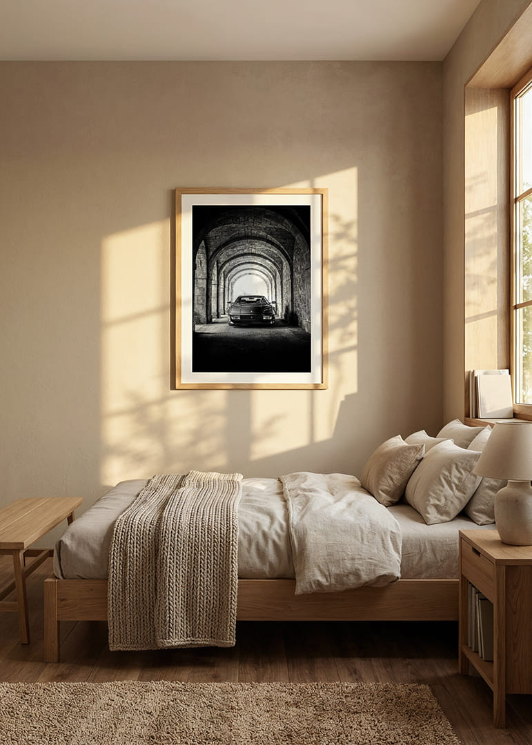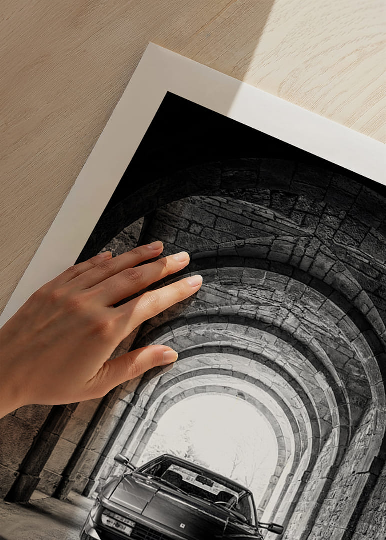 Denna poster fångar den tidlösa elegansen hos en Ferrari Testarossa, placerad mitt i en stentäckt valvpassage. De djupa skuggorna som omger bilen skapar en mystisk och stämningsfull atmosfär som för tankarna till en svunnen era av lyx och kraft. Kontrasten mellan bilens ikoniska design och den råa stenarkitekturen ger motivet en dramatisk närvaro. En poster som tillför rummet både nostalgi och sofistikerad styrka, och som blir en självklar blickpunkt i inredningen.