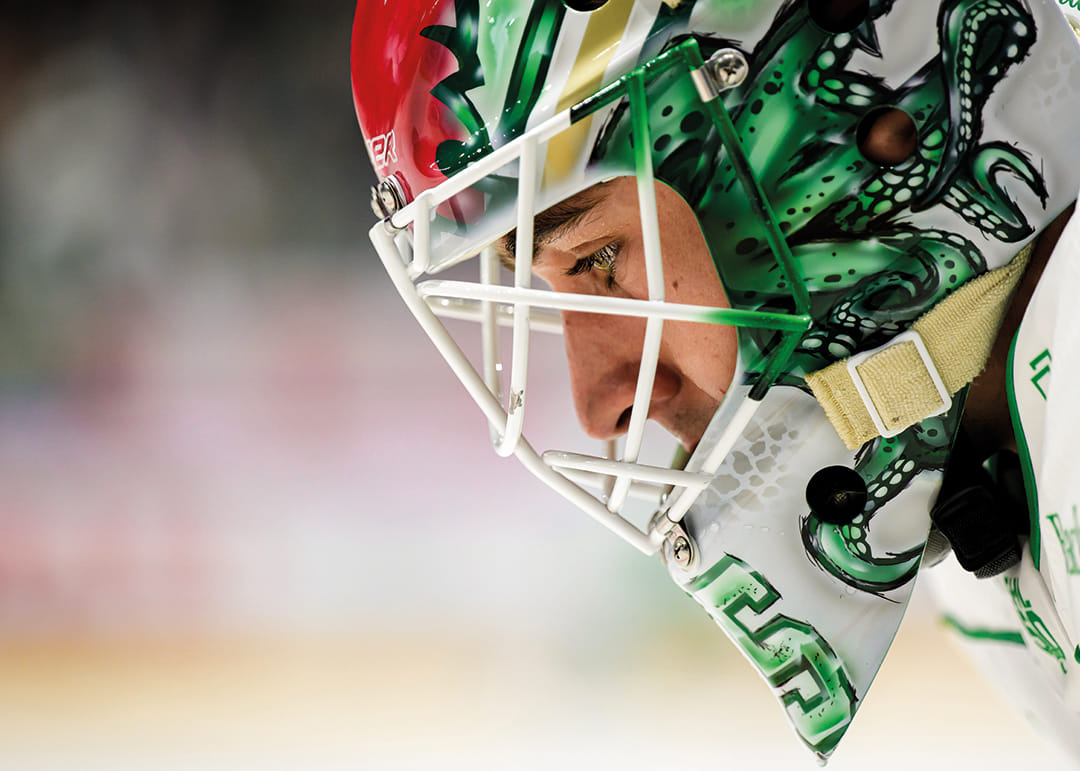 Rögles målvakt Arvid Holm under värmningen inför ishockeymatchen i SHL mellan Färjestad och Rögle den 13 september 2025 i Karlstad.