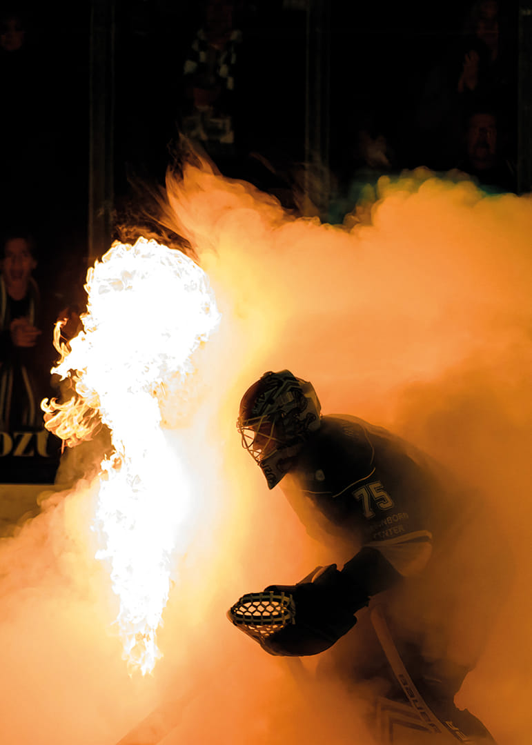Rögles målvakt Arvid Holm gör entré inför ishockeymatchen i SHL mellan Rögle och Luleå den 30 oktober 2025 i Ängelholm.