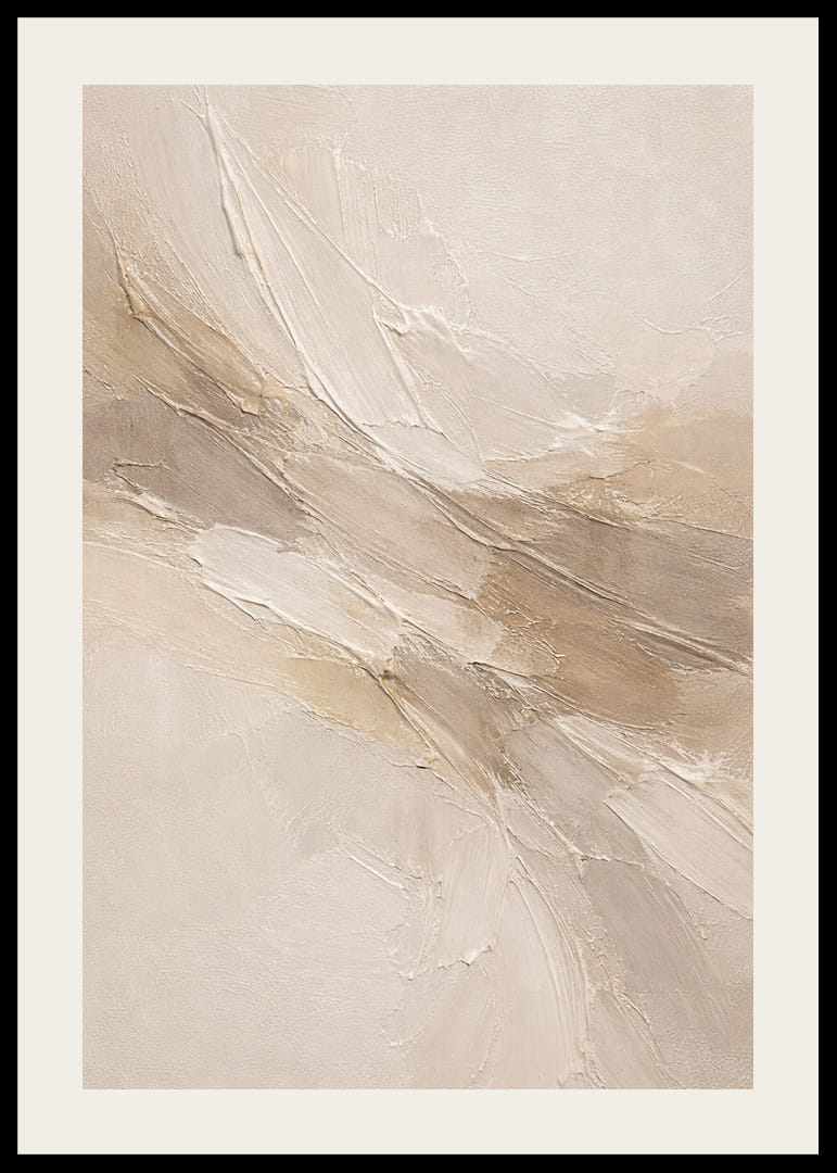 Denna poster omfamnar ögonblicket med mjukhet och elegans. Tonerna av beige och kräm flyter samman i subtila stråk som liknar en lugn bris. Det är som om naturens ömtåliga rörelser fångats på duken. Postern tillför en känsla av stillhet och balanserad skönhet, vilket gör den perfekt för att skapa en fridfull atmosfär i ett hem. Ett tidlöst tillskott som talar till alla som älskar lugn och harmoni.