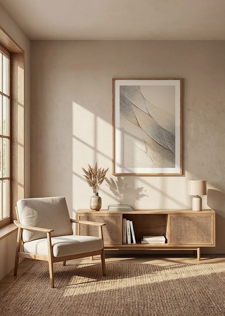 Denna poster skapar en rogivande atmosfär med sina mjuka, jordnära toner och subtila lager som vävs harmoniskt genom kompositionen. De böljande linjerna och skiftningarna i färg fångar ögat och ger ett känslomässigt djup som väcker eftertanke. Med sin eleganta enkelhet bidrar denna poster till en sofistikerad och lugn inredning, vilket gör den till ett perfekt tillskott i alla rum.