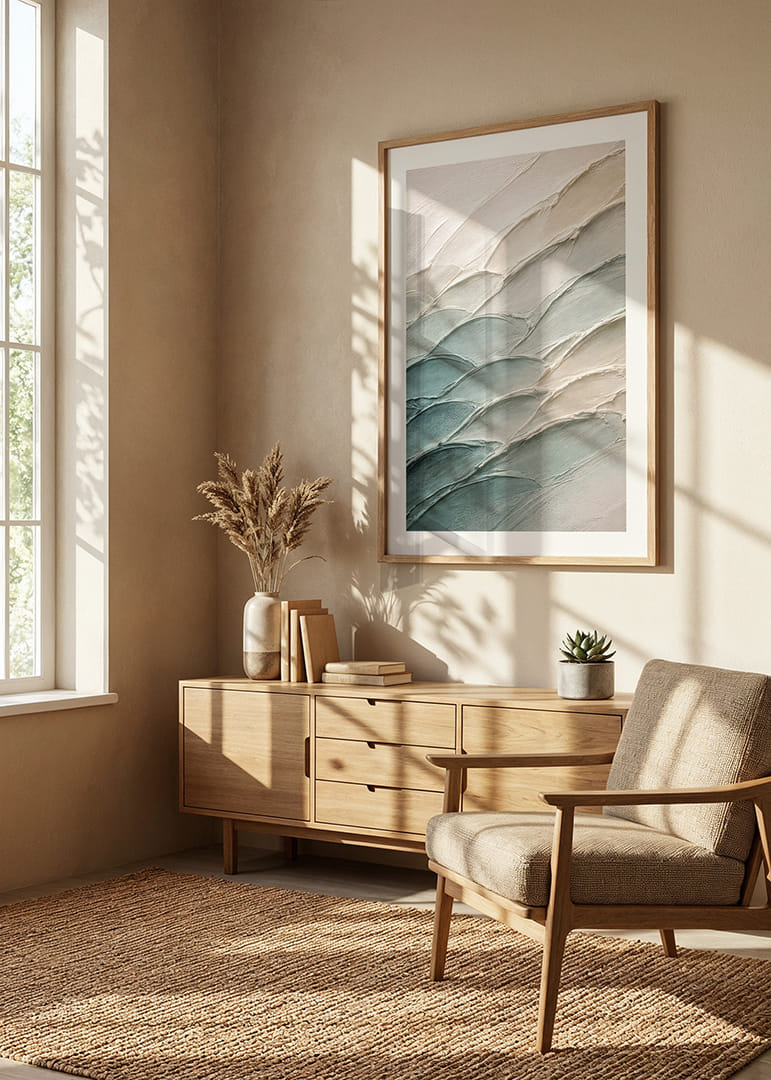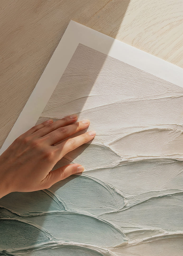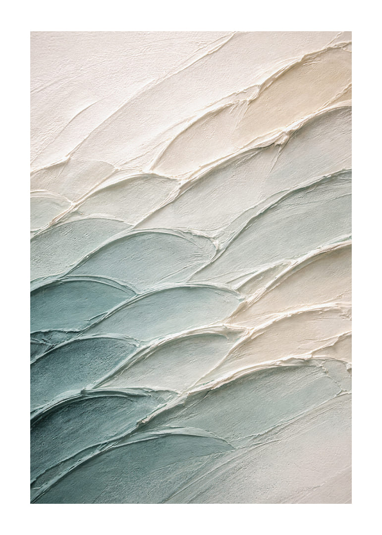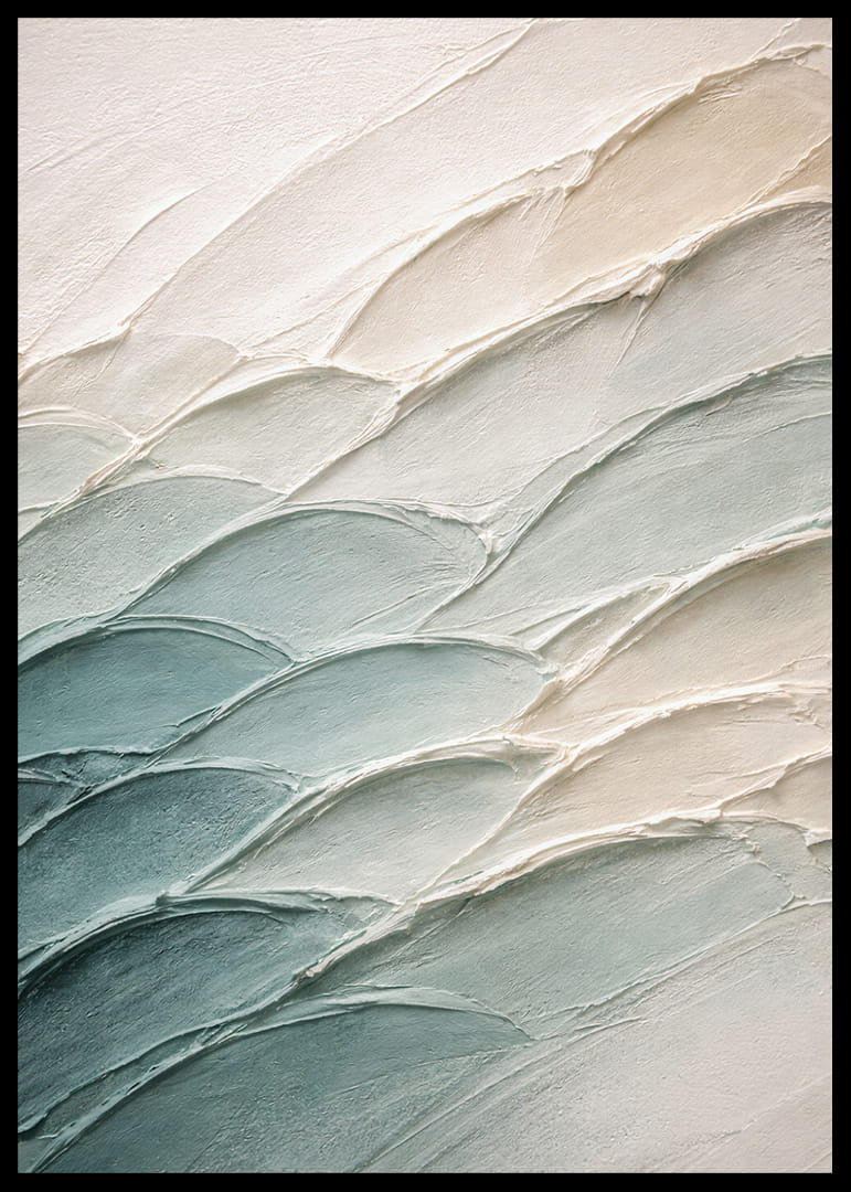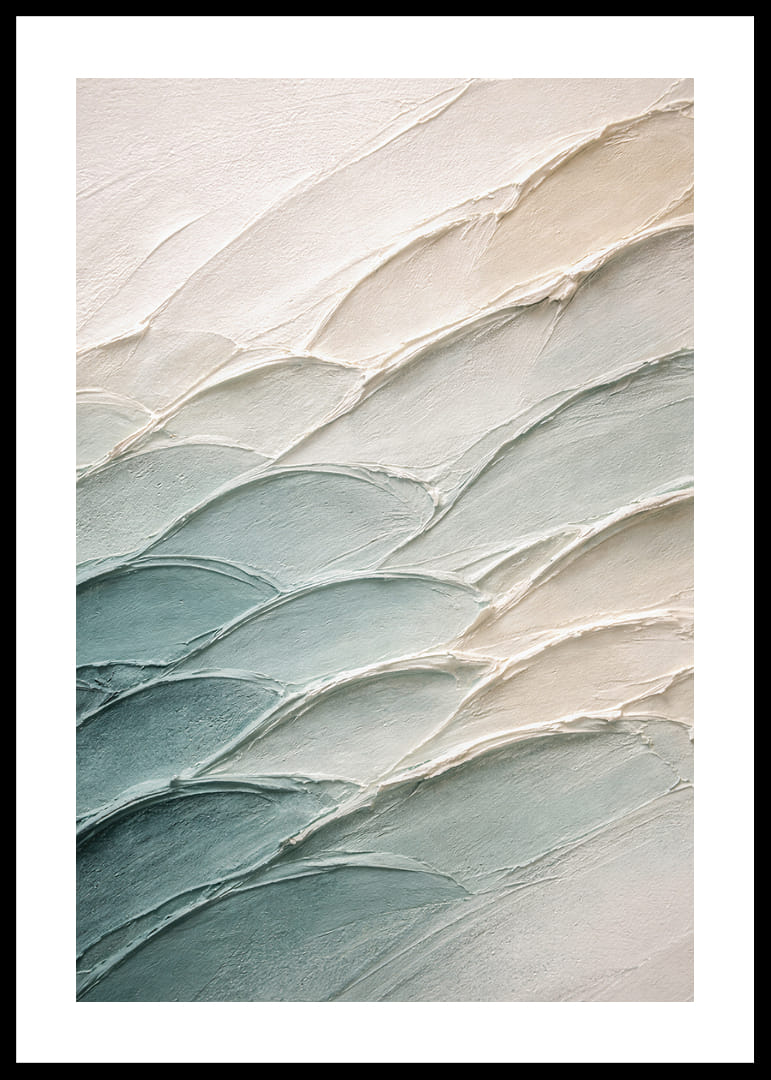 Denna poster fångar en känsla av frid genom sina mjuka penseldrag i blå och beige toner. Varje linjes mjuka böljande rörelse leder ögat genom en harmonisk resa, vilket skapar en atmosfär av lugn och stillhet. Perfekt för alla som söker en visuell flykt från vardagen, ger postern ett elegant och stilrent uttryck till ditt hem, som både förskönar och lugnar miljön.