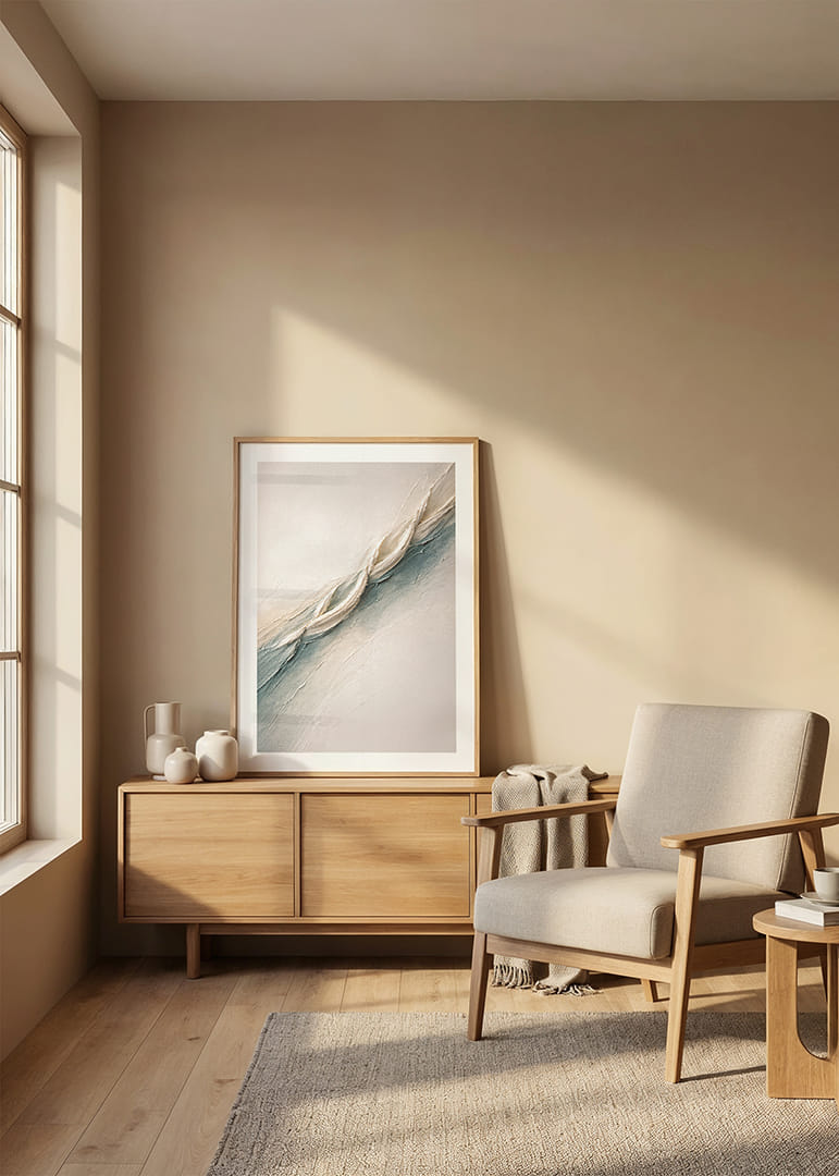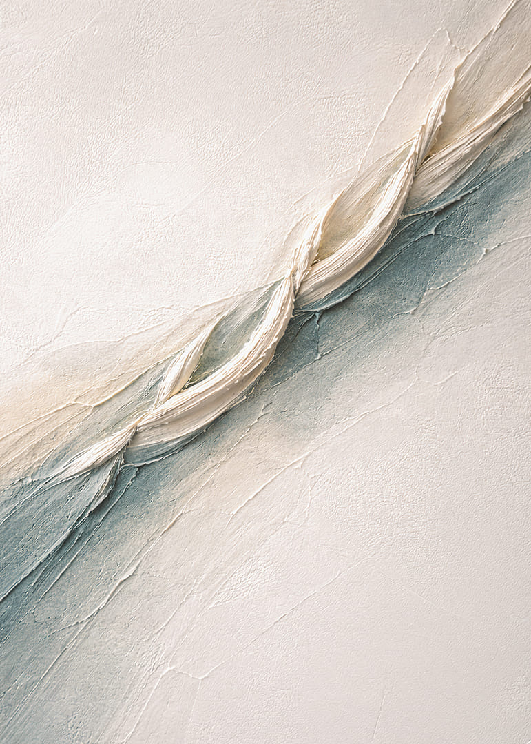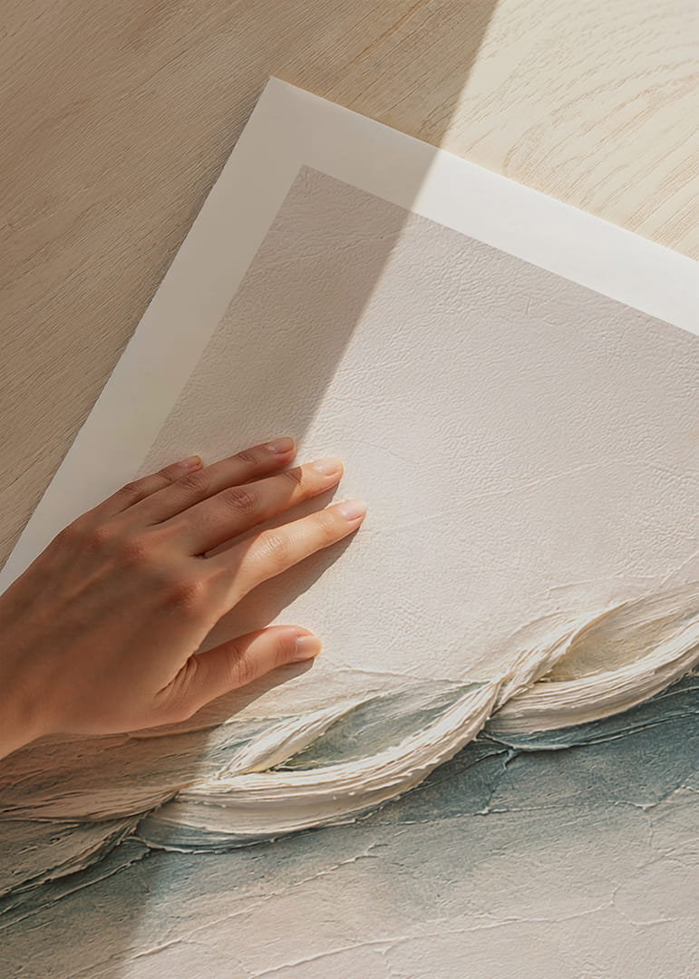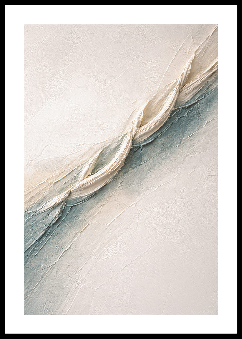 Denna poster fångar ögat med en harmonisk blandning av mjuka, böljande texturer som påminner om en stilla strandkant. De lugna, gräddvita och blå tonerna väcker en känsla av frihet och ro, som att viska hemligheter från havet. Perfekt för att tillföra en elegant och fridfull atmosfär i ditt hem, smälter denna poster sömlöst in i olika miljöer och höjer ditt rum till en plats av avkoppling.