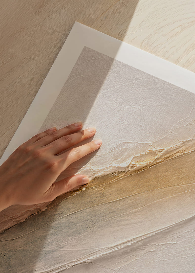 Denna poster utstrålar en subtil elegans med sina jordnära färger och intrikata mönster. Strukturen och nyanserna fångar ett lugn som omfamnar dig och fyller rummet med en harmonisk energi. Posterns minimalistiska stil gör den idealisk för att skapa en avslappnad och sofistikerad miljö i vilket utrymme som helst, vilket ger en tidlös känsla av skönhet och balans.