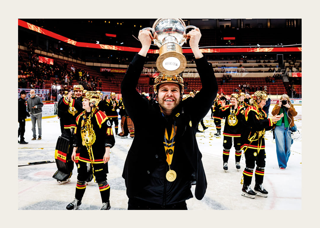 Brynäs tränare Filip Eriksson jublar efter final tre i SDHL mellan Brynäs och Frölunda den 27 mars 2026 i Gävle.