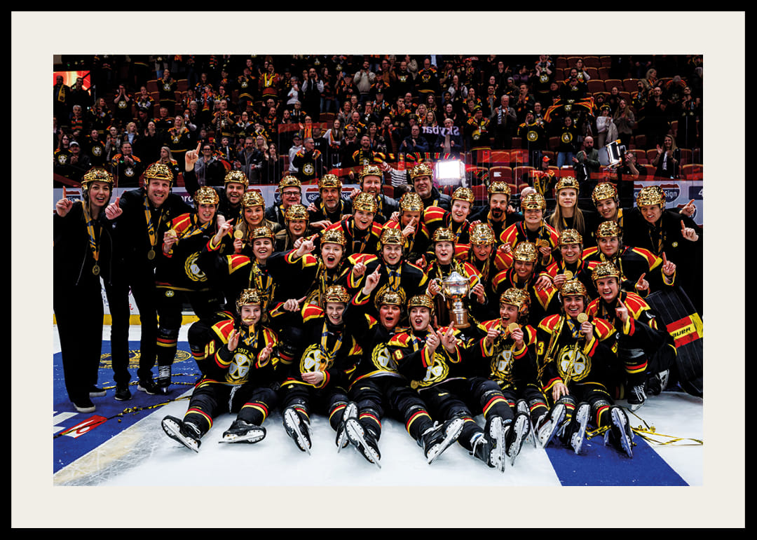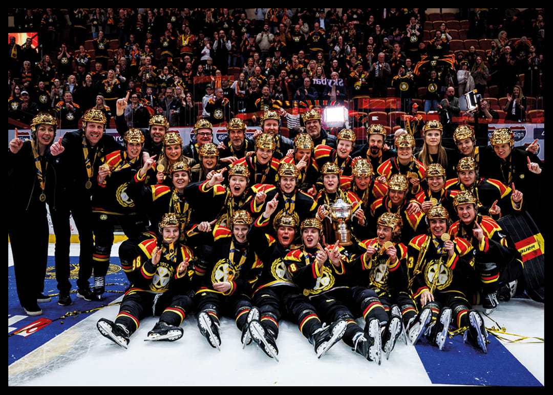 Brynäs spelare jublar med pokalen efter final tre i SDHL mellan Brynäs och Frölunda den 27 mars 2026 i Gävle.