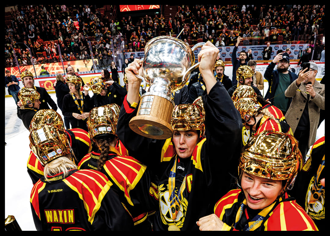 Brynäs spelare jublar med pokalen efter final tre i SDHL mellan Brynäs och Frölunda den 27 mars 2026 i Gävle.