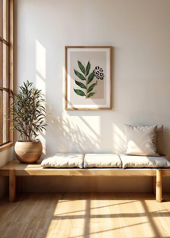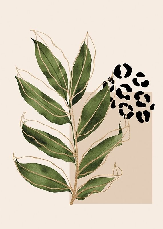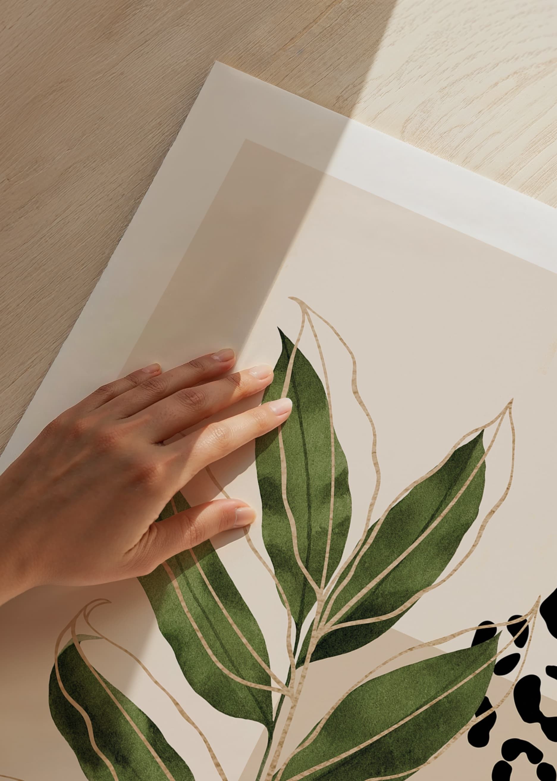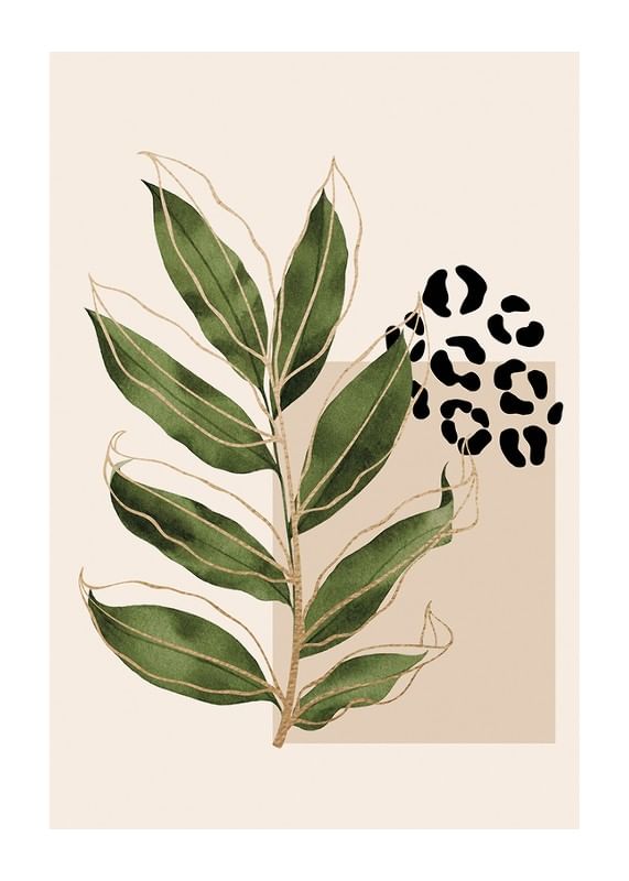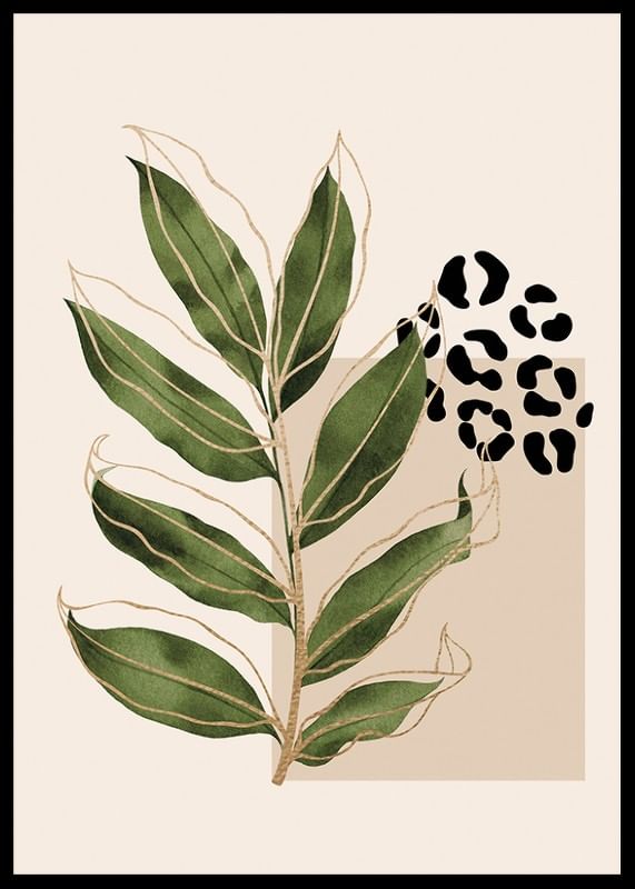 Poster med abstrakt motiv på en växt med gröna blad, line art och tassmönster mot en sandfärgad bakgrund.