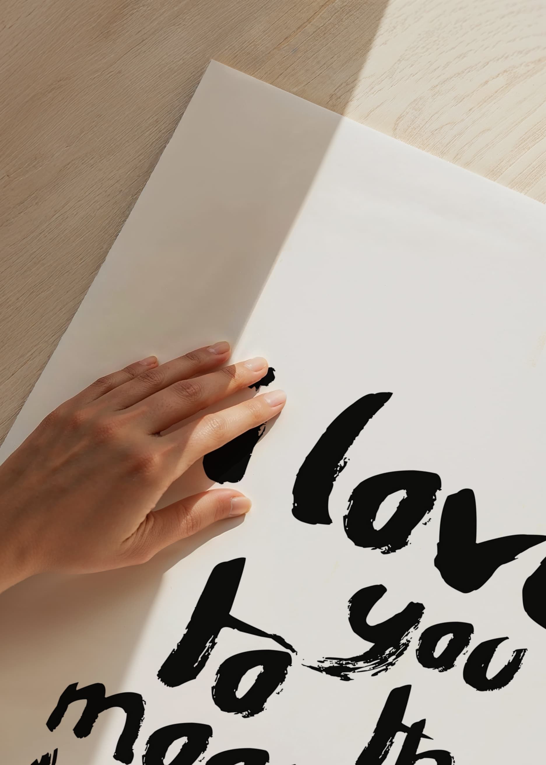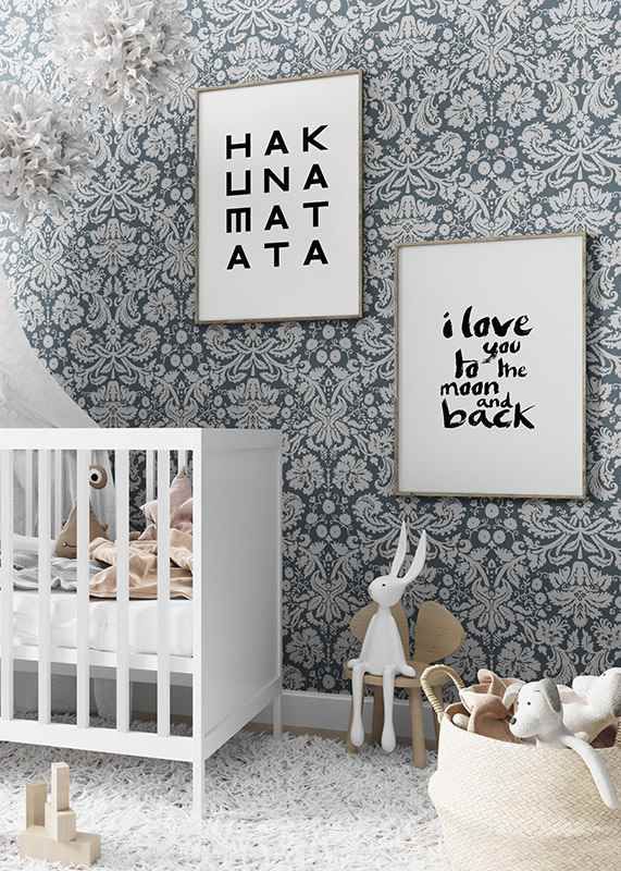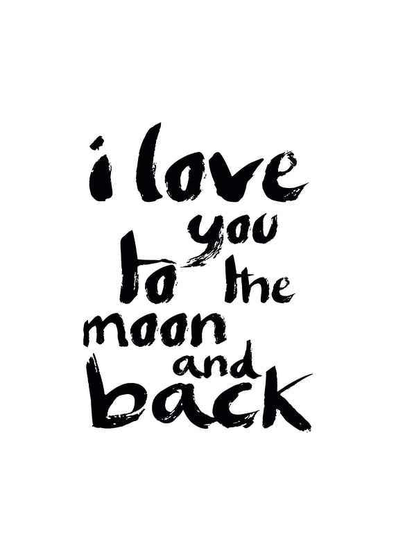 Supergullig poster med texten "i love you to the moon and back" i svart mot vit bakgrund. Denna populära poster för barnrummet är en av våra absoluta storsäljare och en given favorit bland föräldrar.