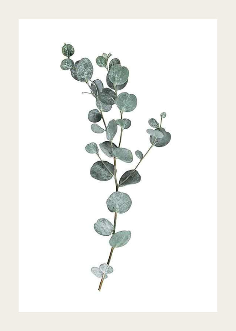 Eukalyptuskvist med runda, matta blågröna blad mot helt vit bakgrund. De enkla linjerna och det avskalade uttrycket ger motivet ett modernt intryck. Denna poster lyfter in naturinspirerade detaljer i hemmet och passar lika bra ovanför soffan som i en arbetsplats där ett grönt tema önskas.