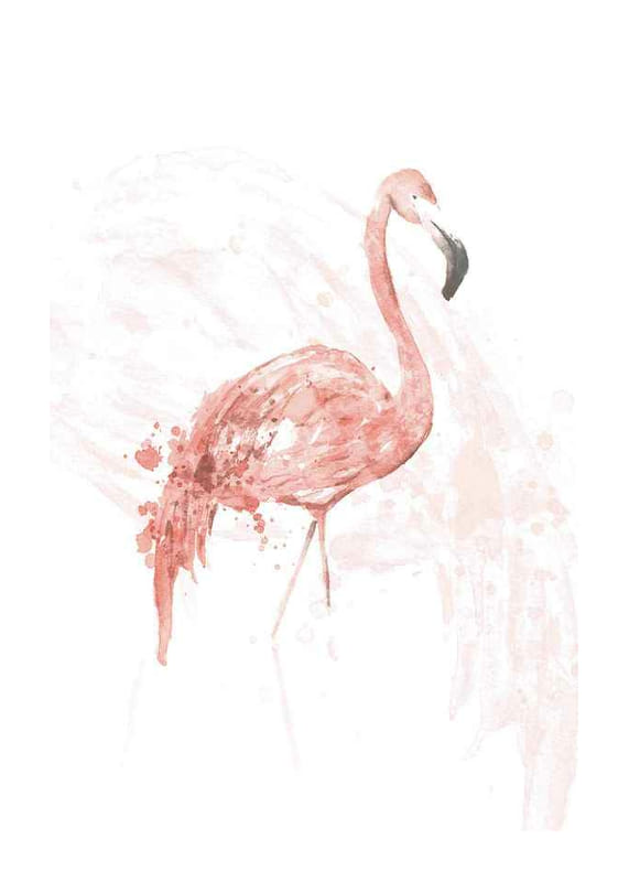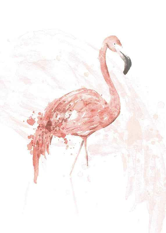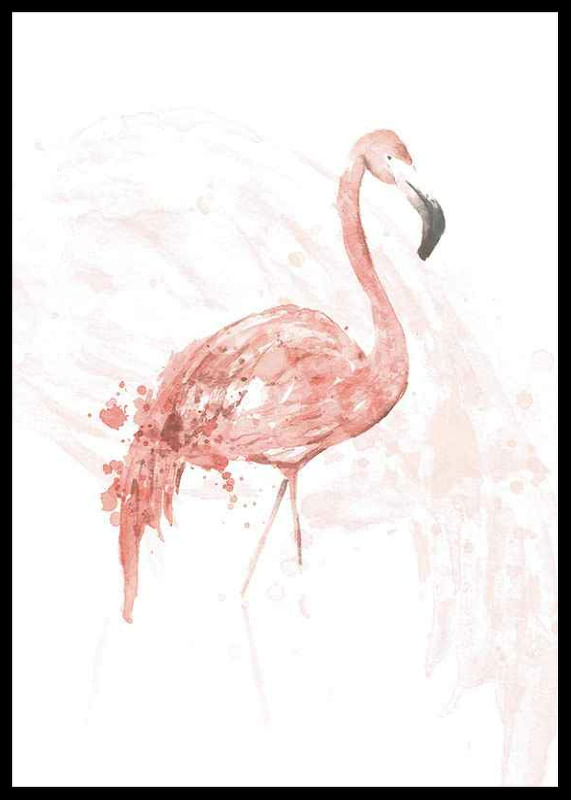 Stående flamingo i mjuka rosa akvarelltoner med detaljer i vitt och svart näbb. Fjäderdräkten är målad med fina penseldrag och diskreta färgstänk, vilket skapar en luftig och konstnärlig känsla. Denna poster ger ett ljust och lätt uttryck som passar utmärkt i både vardagsrum och sovrum för en subtil touch av natur.