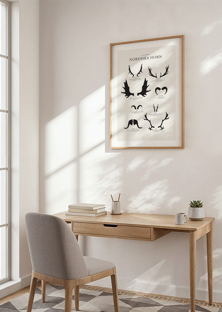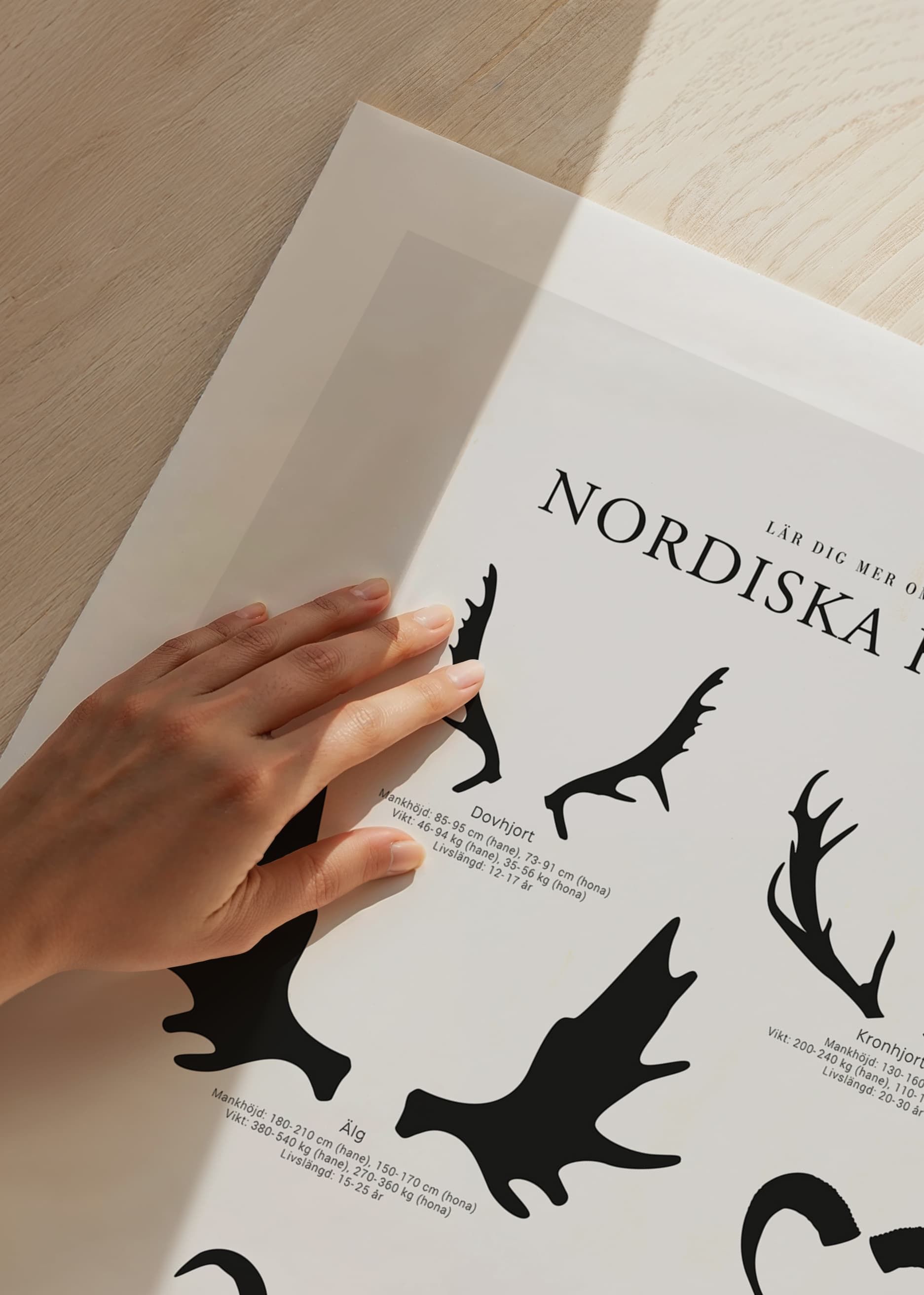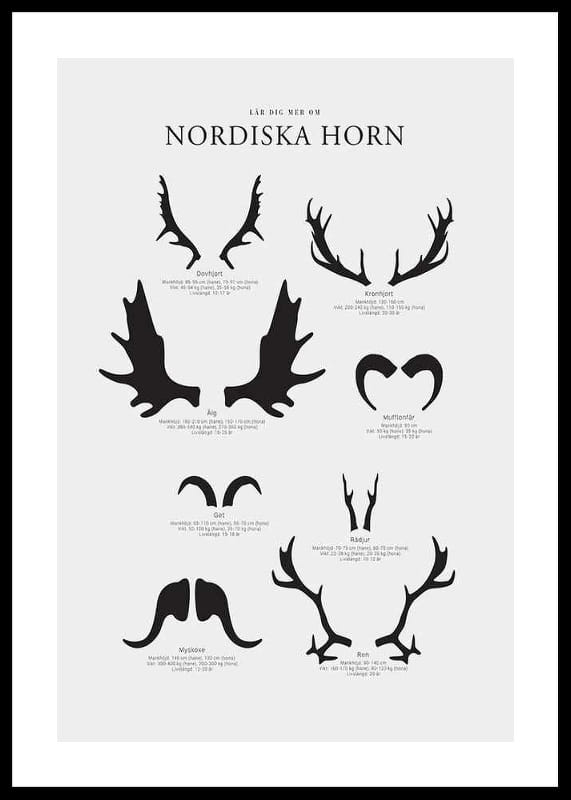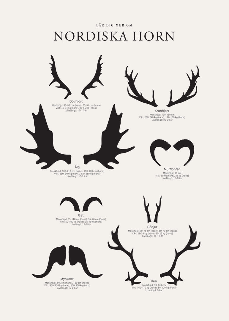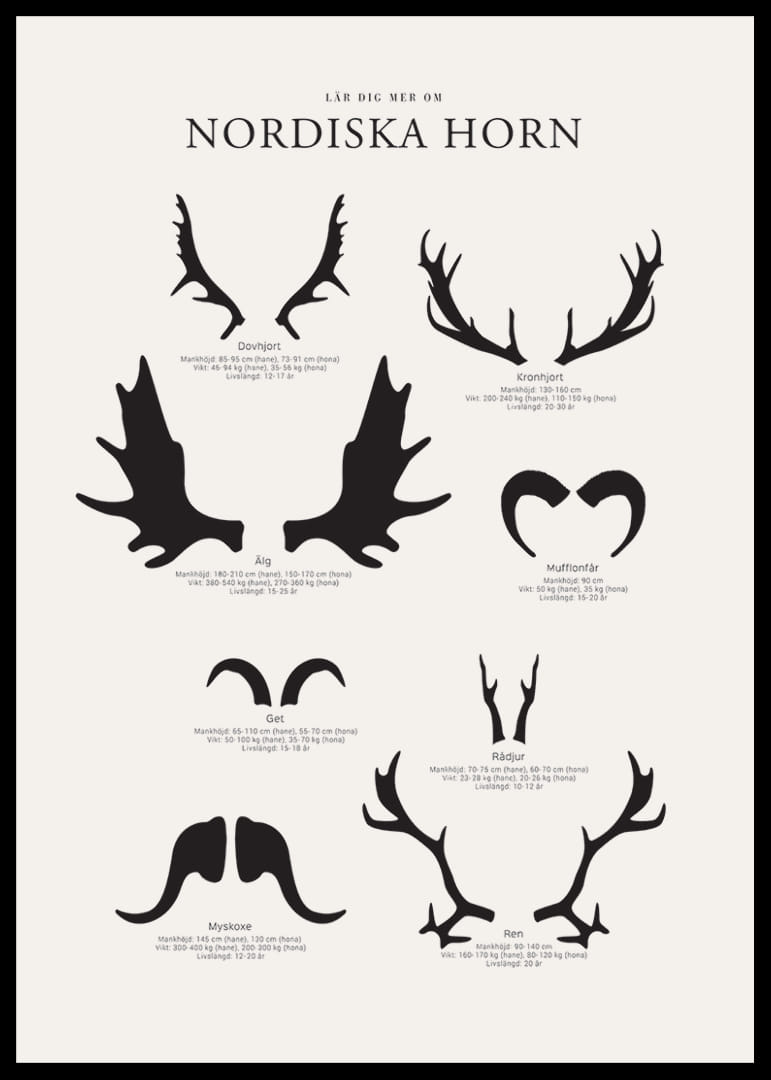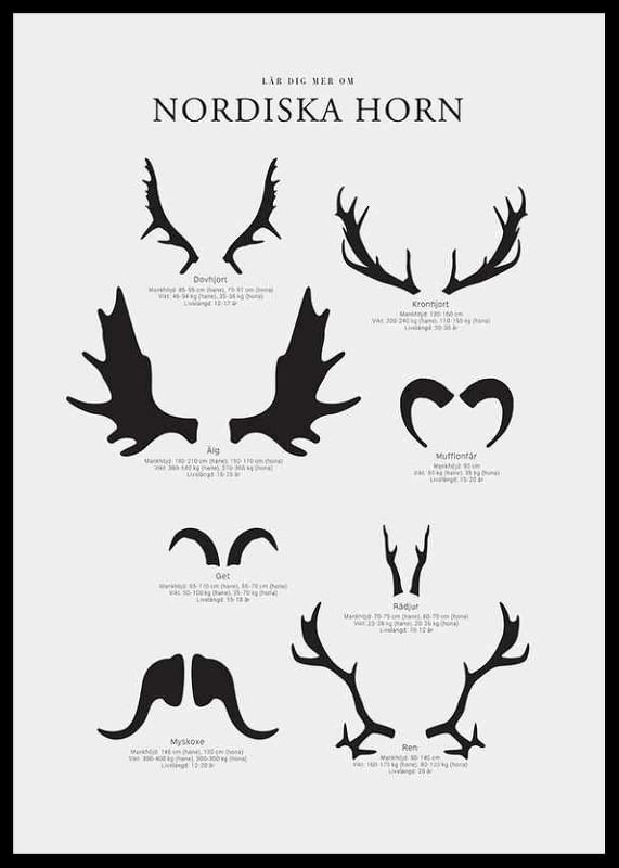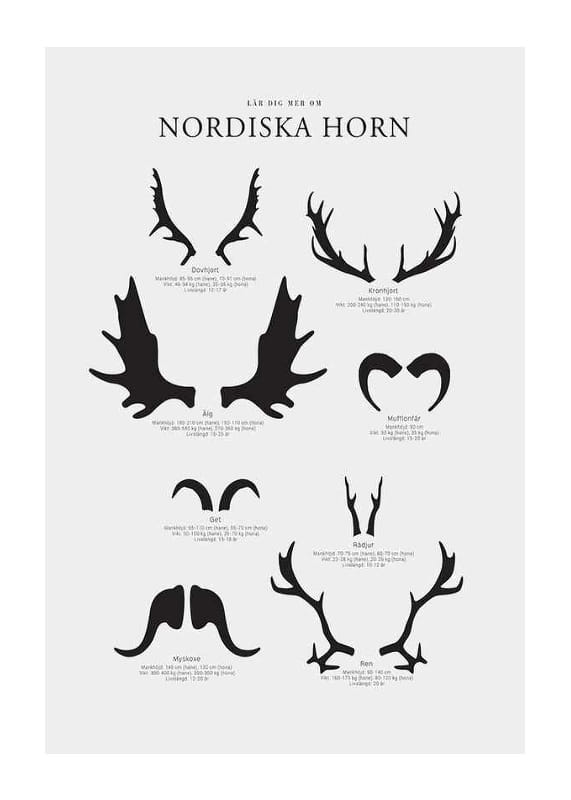 Olika nordiska djurhorn illustreras i svart mot ljus bakgrund, tydligt uppdelade med namn och fakta om arten. Här syns älg, dovhjort, kronhjort, rådjur, ren, mufflonfår, myskoxe och get. Kombinerad faktatabell och stilren design gör denna poster till ett utmärkt inslag i arbetsrum, barnrum eller vardagsrum.