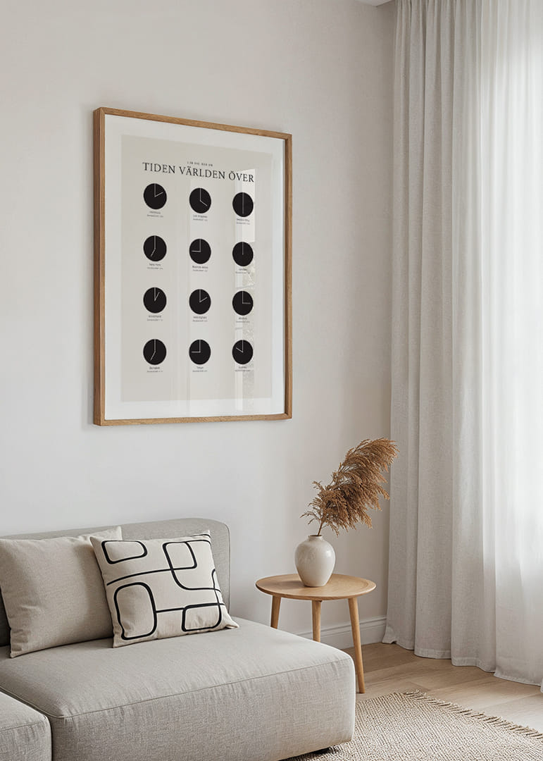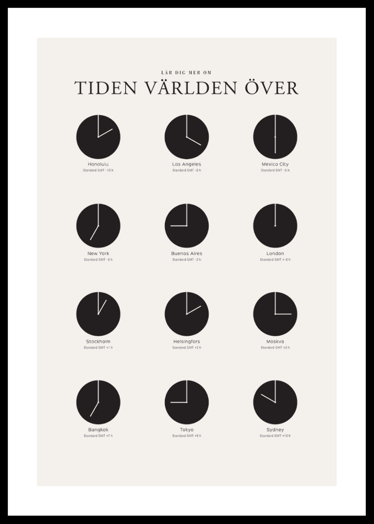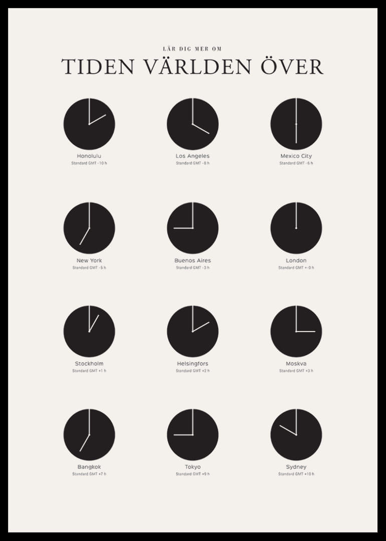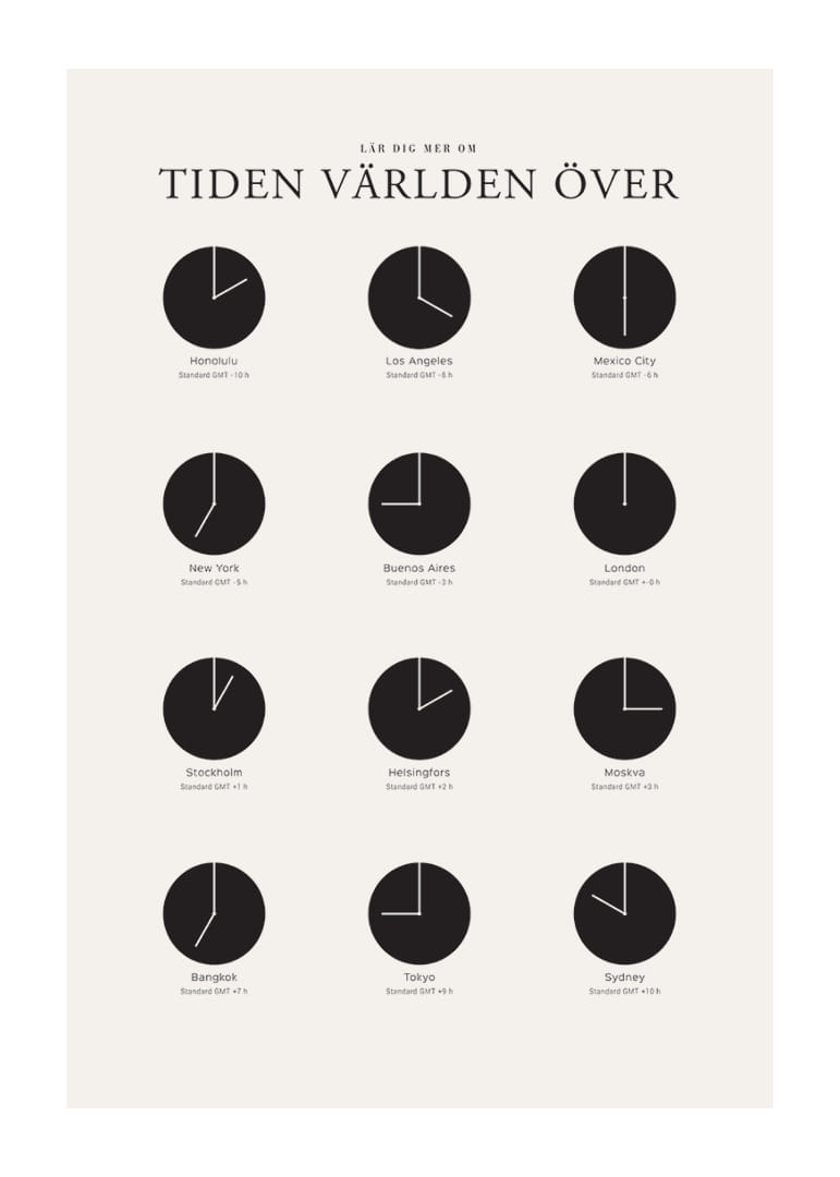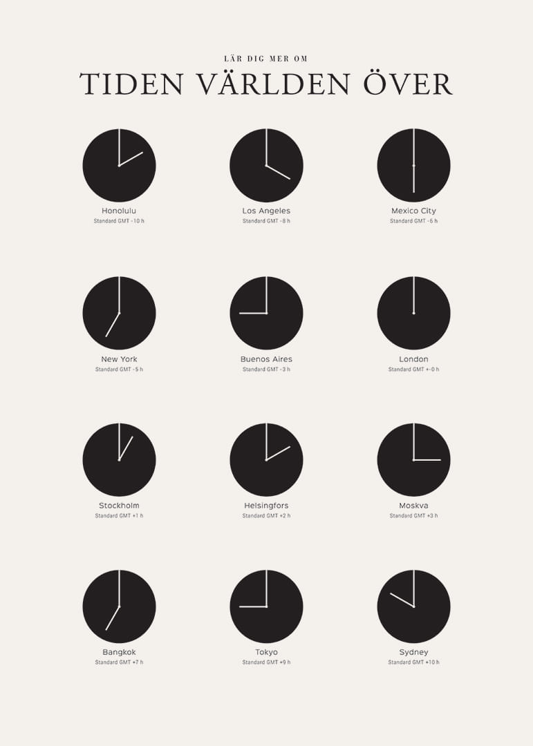 Motivet består av tolv stilrena urtavlor i svart mot ljus bakgrund, där varje klocka visar aktuell tid i olika storstäder runt världen, kompletterad med stadens namn och tidszon. En tydlig och pedagogisk poster som skapar intresse och passar bra både i hemmakontoret och i barnrummet.