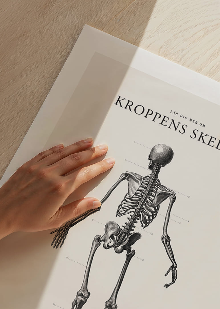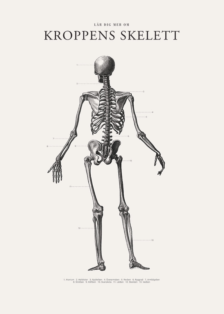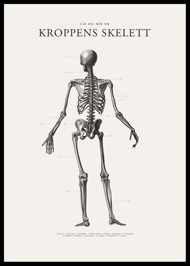 Motivet består av ett människoskelett avbildat bakifrån, utfört i svartvit, vetenskaplig stil med anatomiska benämningar utsatta vid skelettets olika delar. Den stilrena layouten och tydliga presentationen gör denna poster både informativ och dekorativ till exempel i arbetsrum eller barnrum.