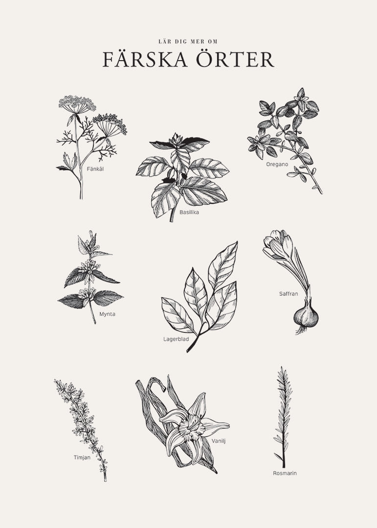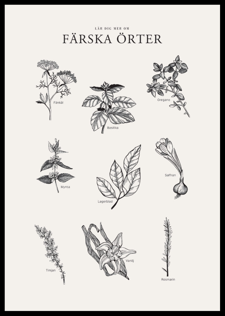 Motivet består av detaljerade svartvita illustrationer av färska örter som fänkål, basilika, oregano, mynta, lagerblad, saffran, timjan, vanilj och rosmarin. Varje ört är namngiven i stilren handskrift mot ljus bakgrund. Den här postern kombinerar botanisk kunskap med grafisk elegans och fungerar väl i både kök och arbetsrum.