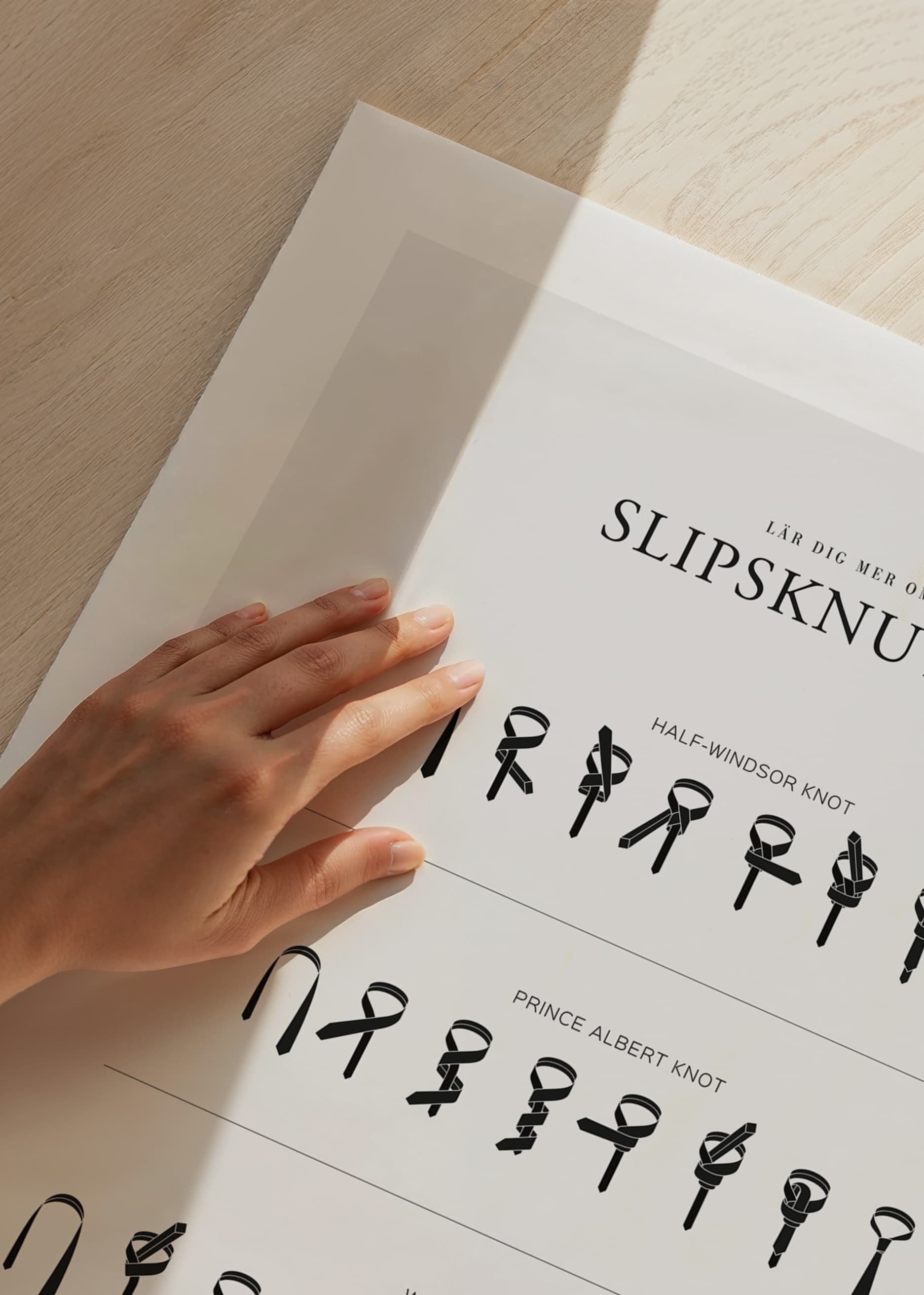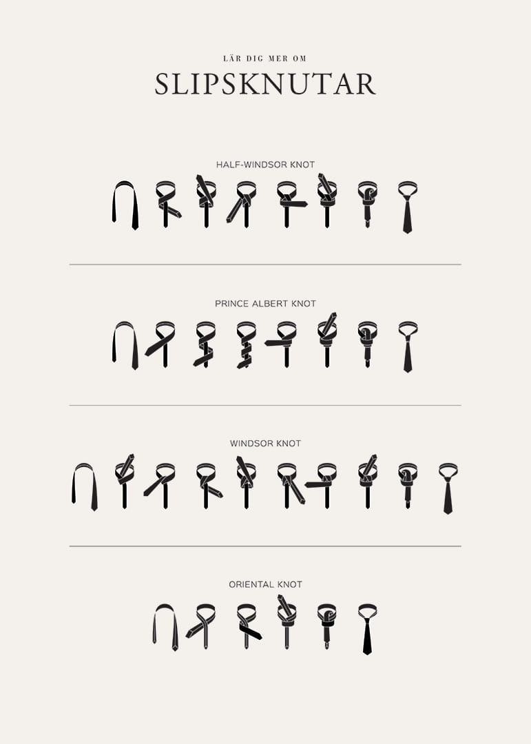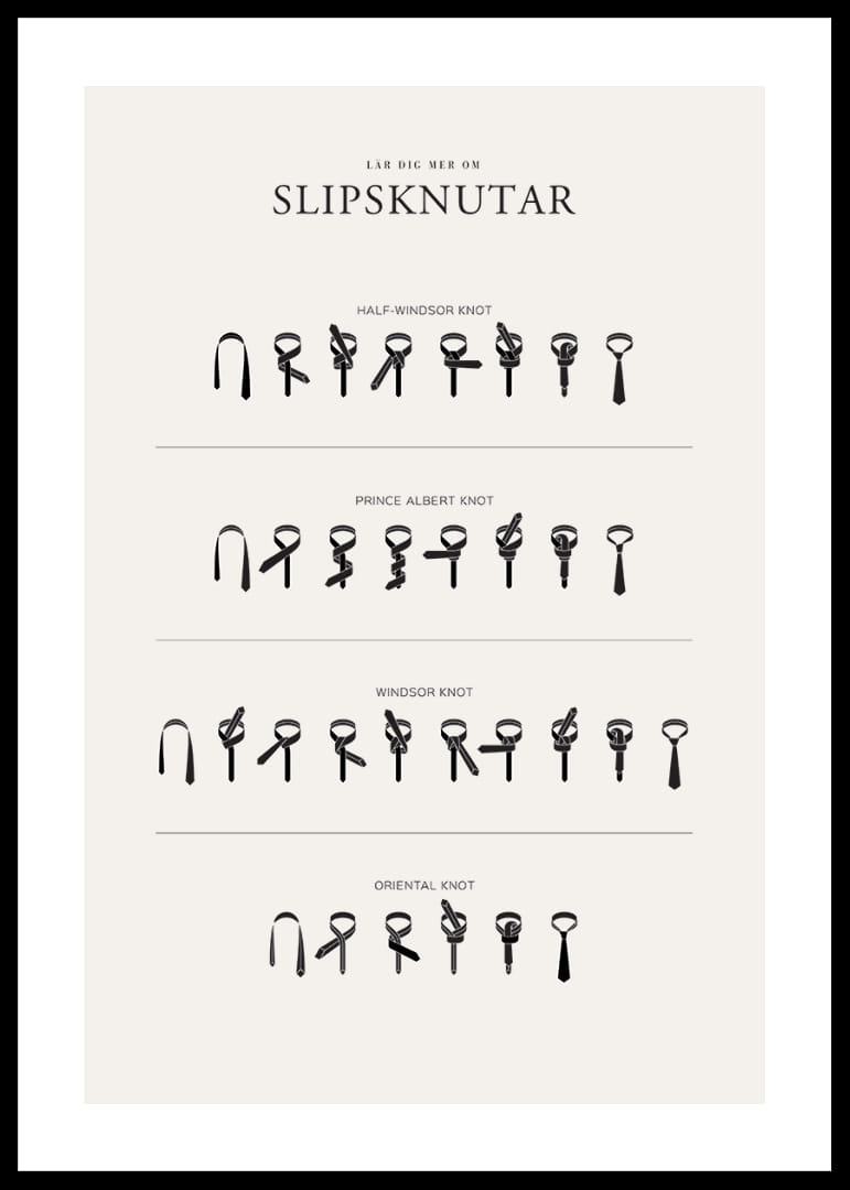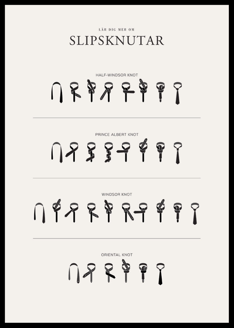 Instruktioner för fyra olika slipsknutar avbildas steg för steg i en grafisk och svartvit stil mot ljus bakgrund. Motivet visar Half-Windsor, Prince Albert, Windsor och Oriental knot tydligt uppdelade med separata rader. En poster som både utbildar och ger ett stilrent intryck, lämplig i exempelvis hall eller sovrum.
