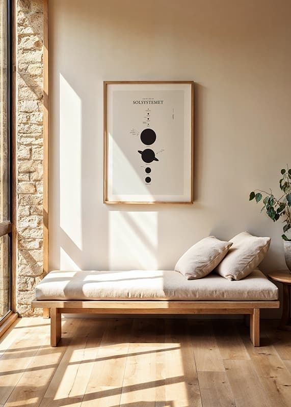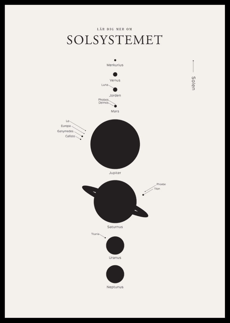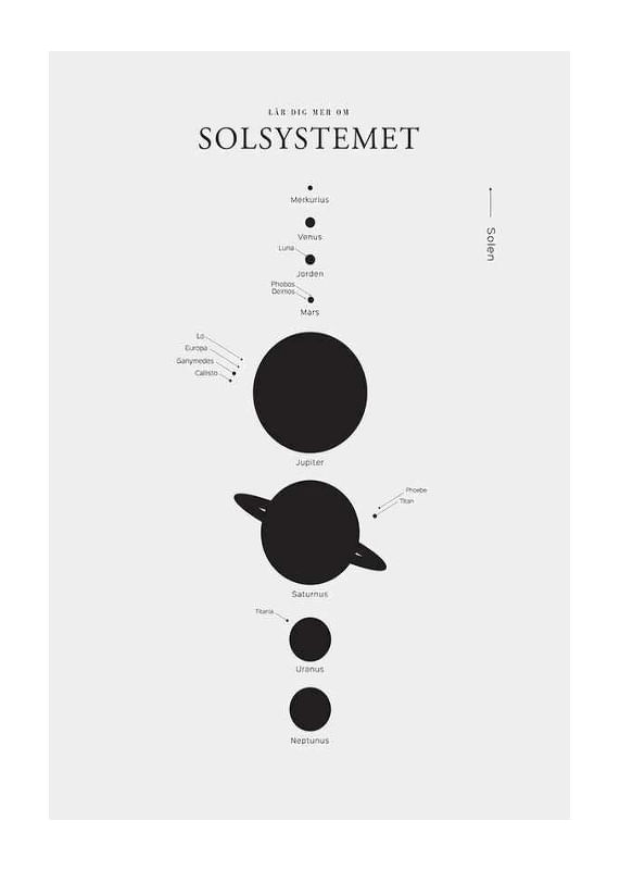 Grafisk översikt av solsystemets planeter i svart och vitt, med tydliga namnangivelser på svenska. Planeterna är stiliserade som fyllda cirklar ordnade vertikalt efter storlek, där Jupiter och Saturnus framträder särskilt. Denna poster passar i barnrum, arbetsrum eller moderna miljöer där fakta och design samspelar.