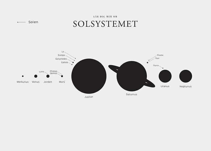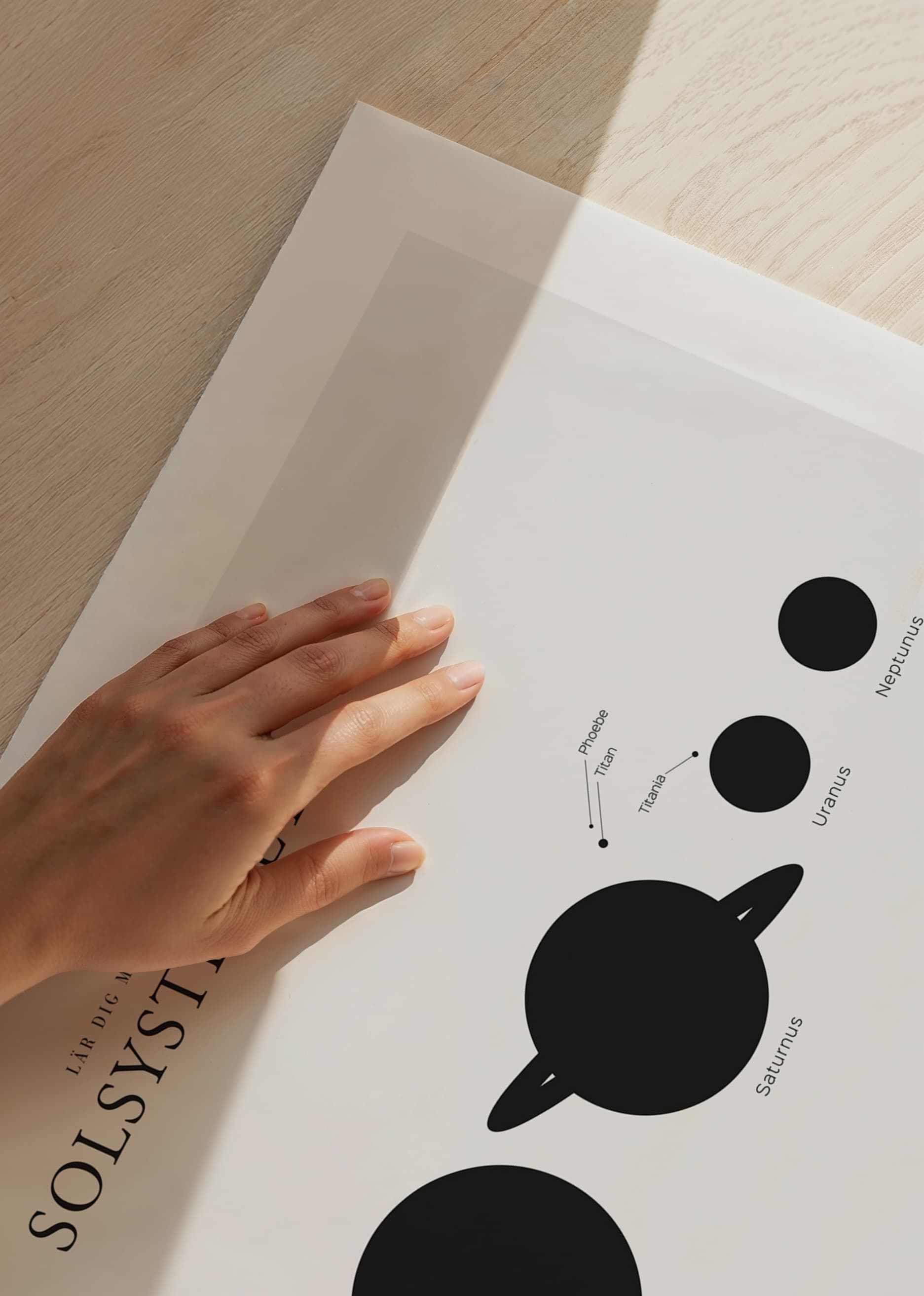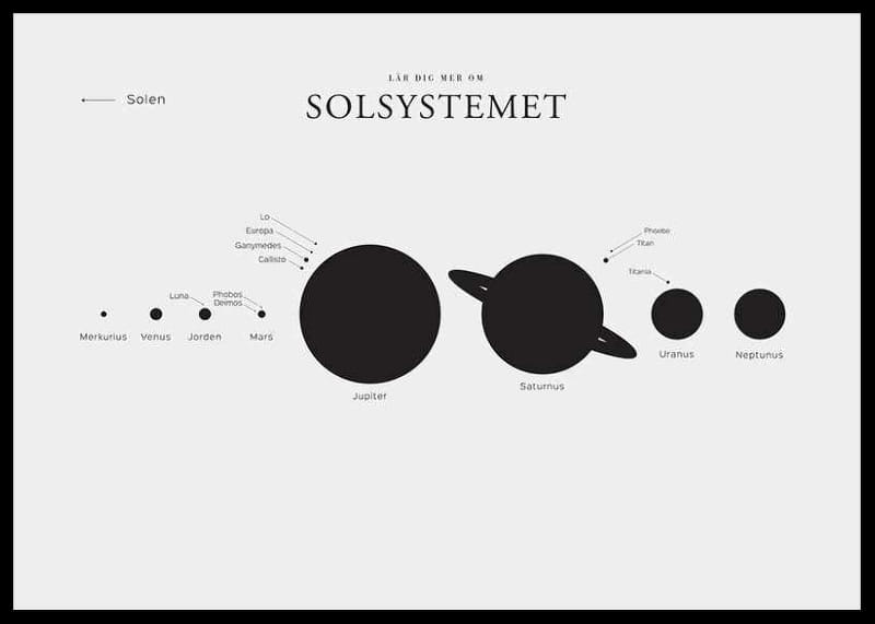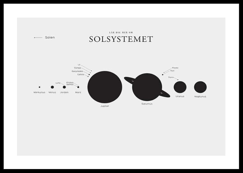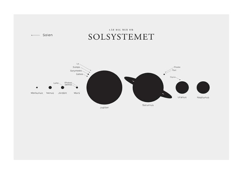 Motivet består av solsystemets planeter i siluett mot ljusgrå bakgrund, där varje planet namnges med tydlig text. Relativa storlekar återges grafiskt, liksom flera av månarnas positioner. En informativ och avskalad poster som kombinerar utbildning och stil, passar väl i barnrum eller i ett modernt hem.