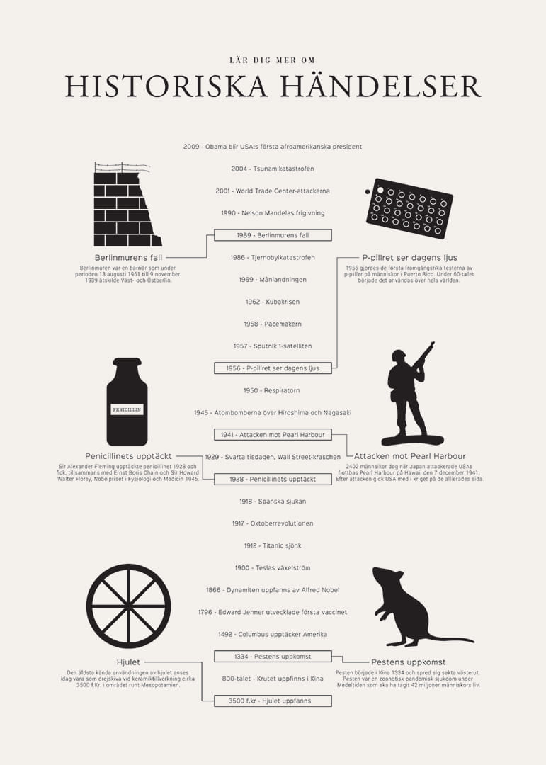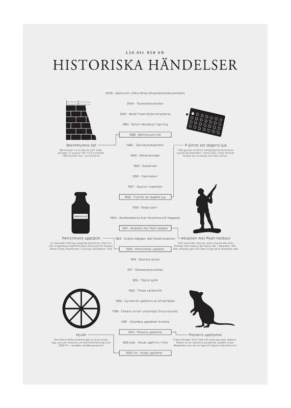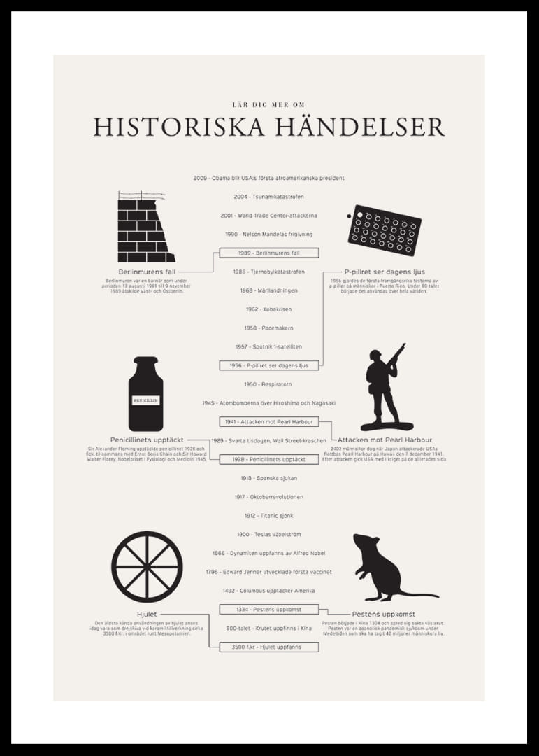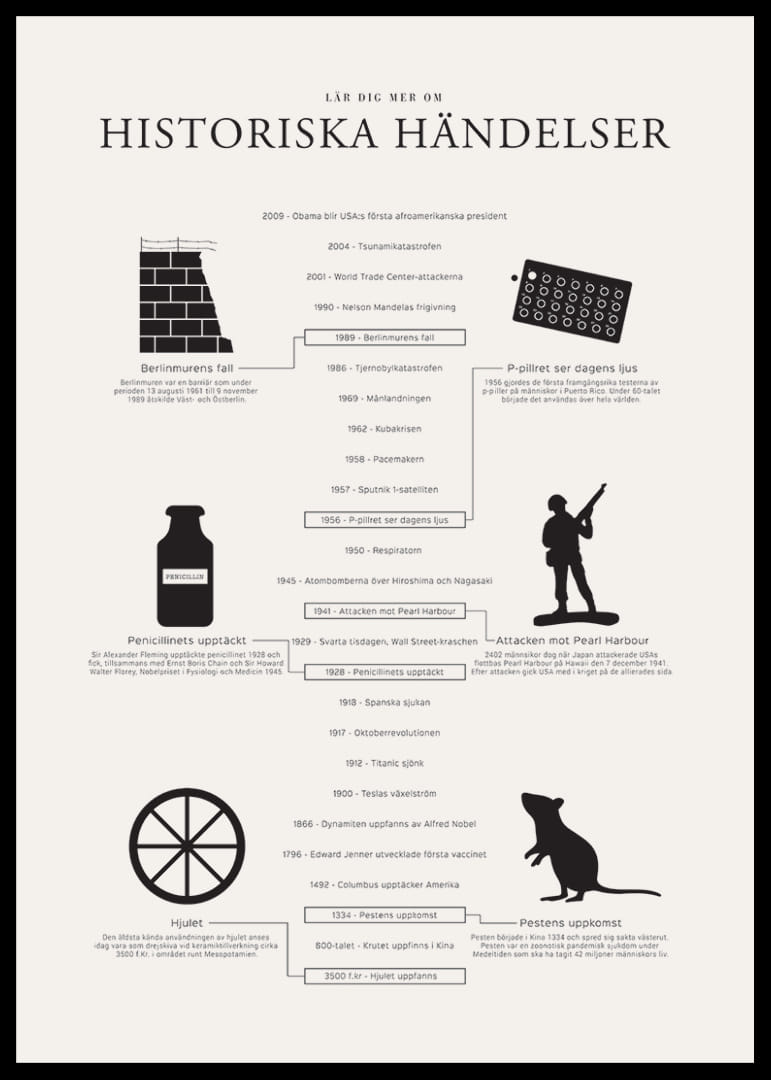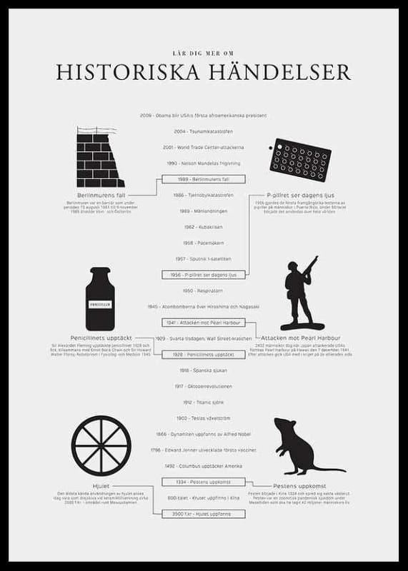 Motivet består av en svartvit tidslinje där viktiga historiska händelser illustreras med stiliserade ikoner och korta faktatexter. Bland annat syns en mur, soldat, råtta, piller och hjul. Denna poster kombinerar informativt innehåll med enkel design och är ett utmärkt inslag i studiehörnan, barnrummet eller arbetsrummet.
