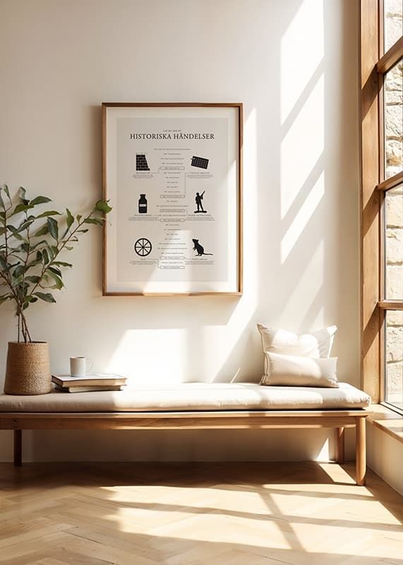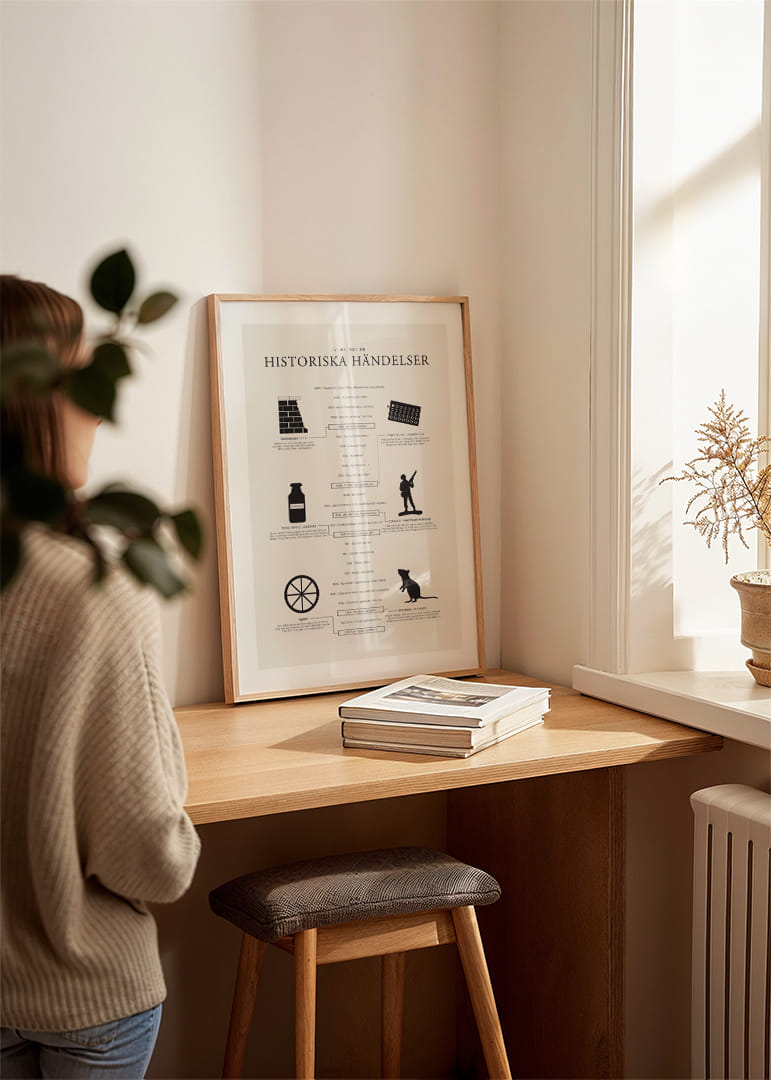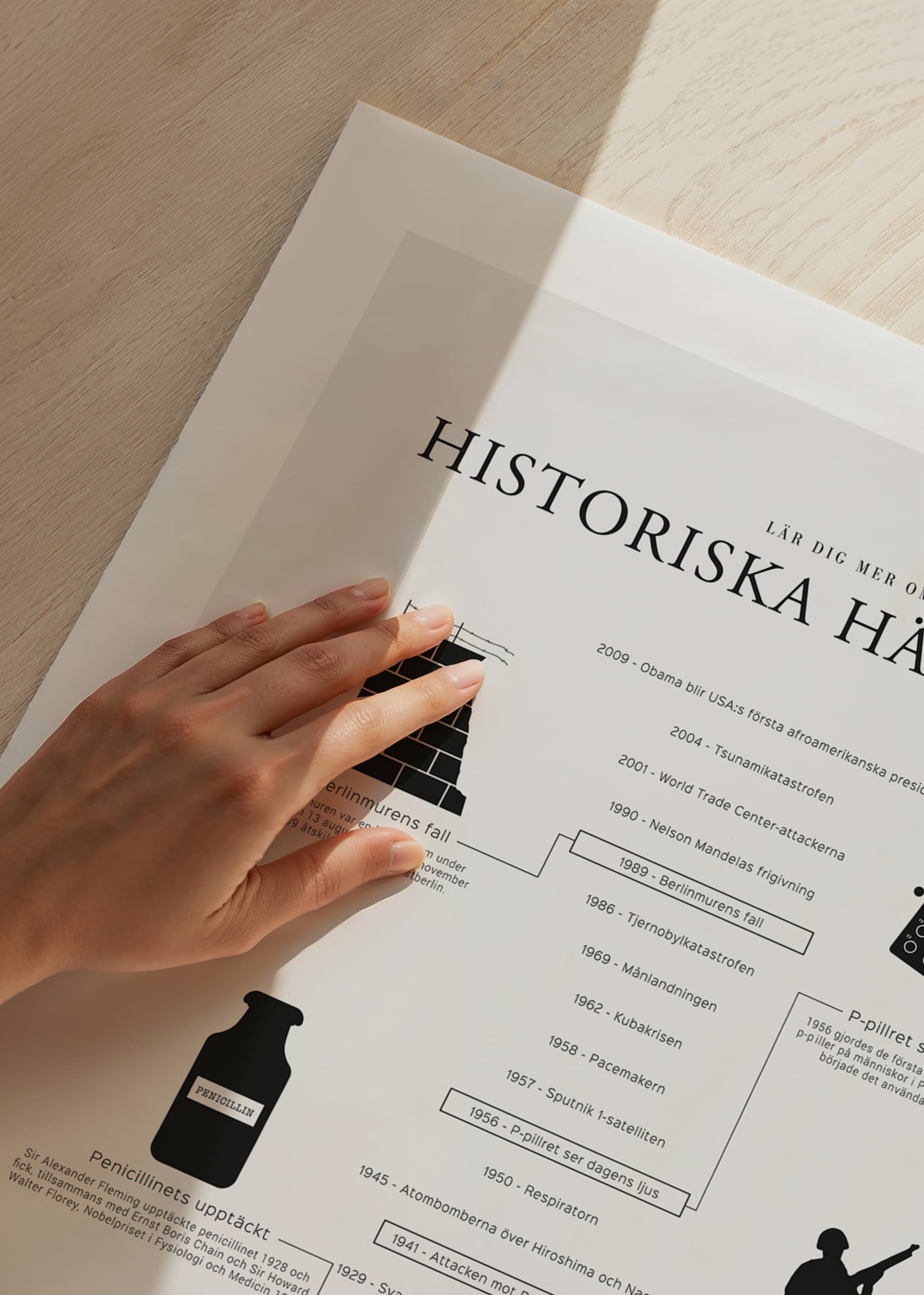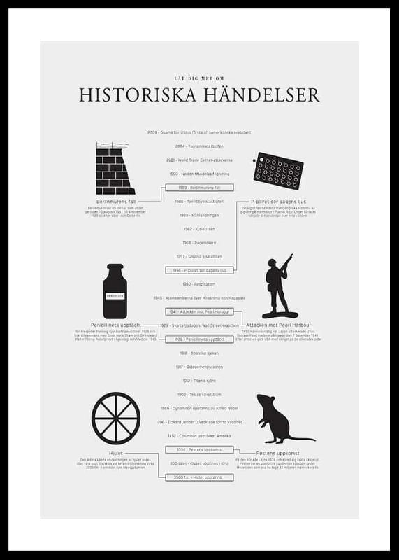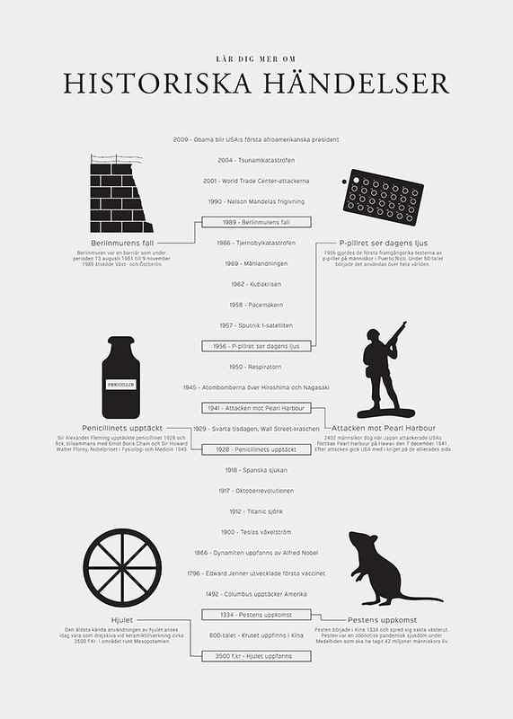 Motivet består av en svartvit tidslinje där viktiga historiska händelser illustreras med stiliserade ikoner och korta faktatexter. Bland annat syns en mur, soldat, råtta, piller och hjul. Denna poster kombinerar informativt innehåll med enkel design och är ett utmärkt inslag i studiehörnan, barnrummet eller arbetsrummet.