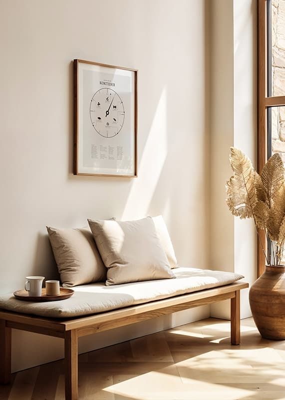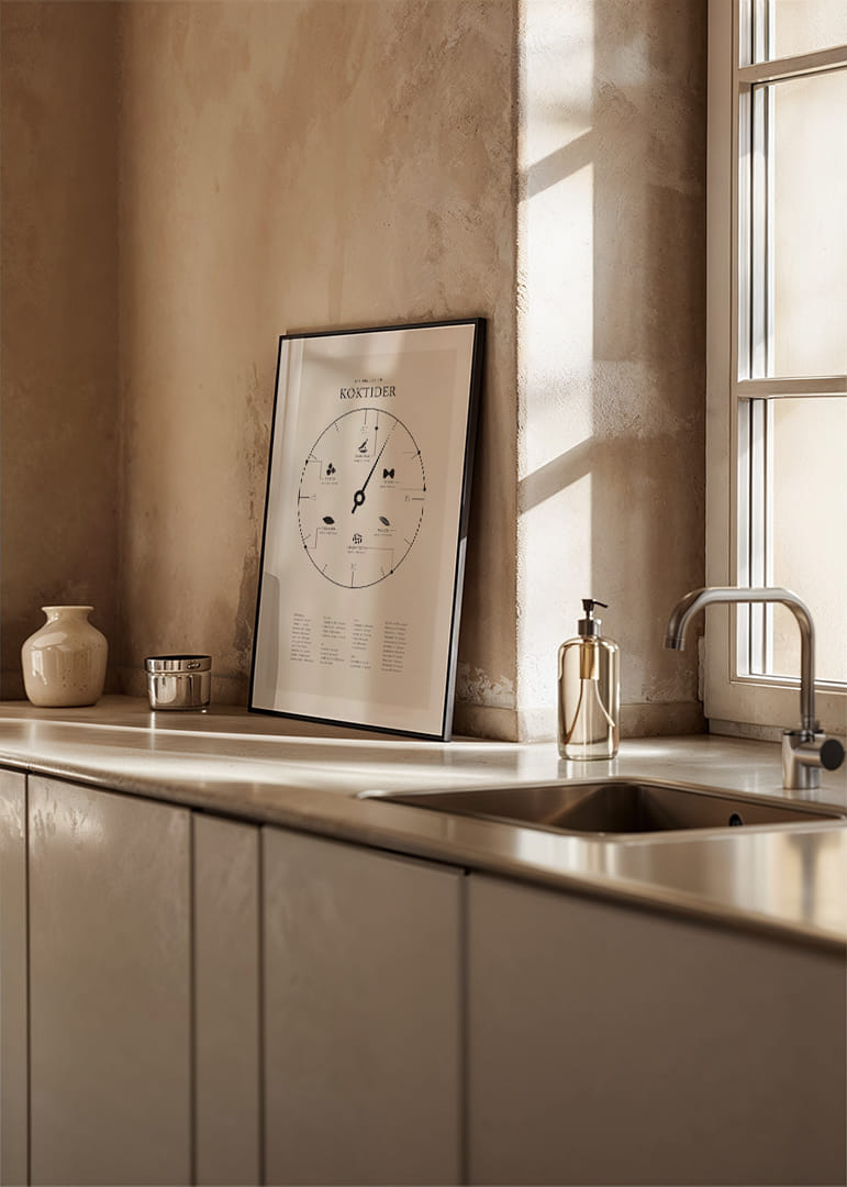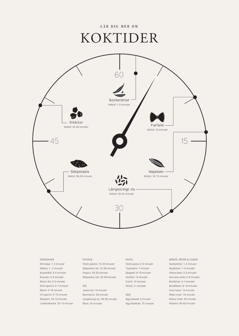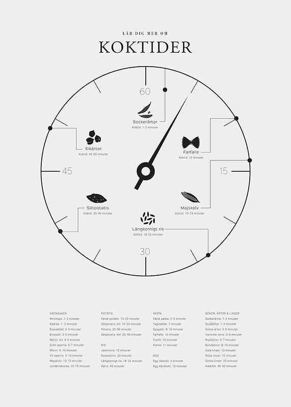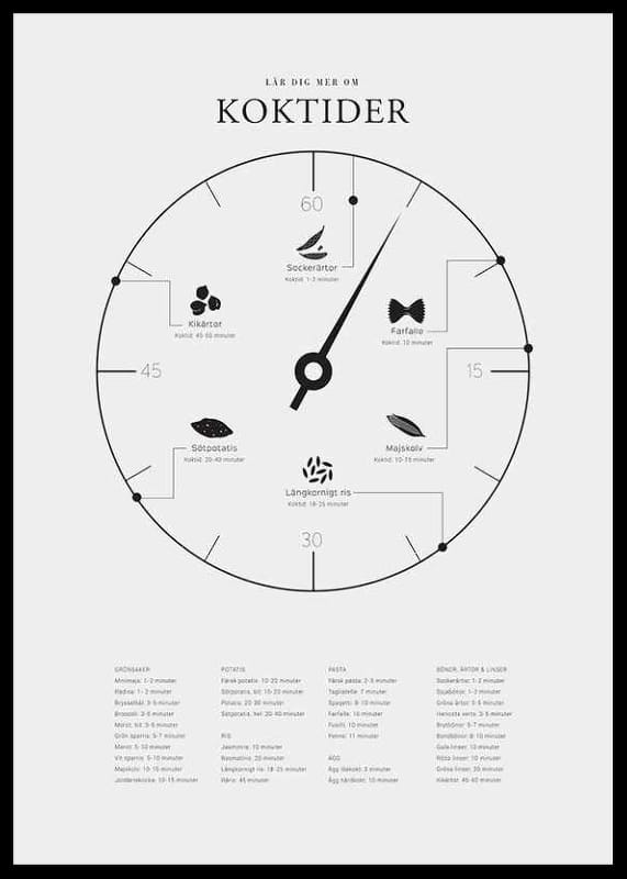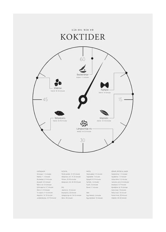 Motivet består av en grafisk cirkel utformad som en klocka, där koktider för vanliga livsmedel som sockerärtor, kikärtor, sötpotatis, ris, majskolv och farfalle illustreras med symboler och texter i svart mot ljus bakgrund. Med sitt stilrena uttryck bidrar postern med både funktion och dekor i kök eller matsal.