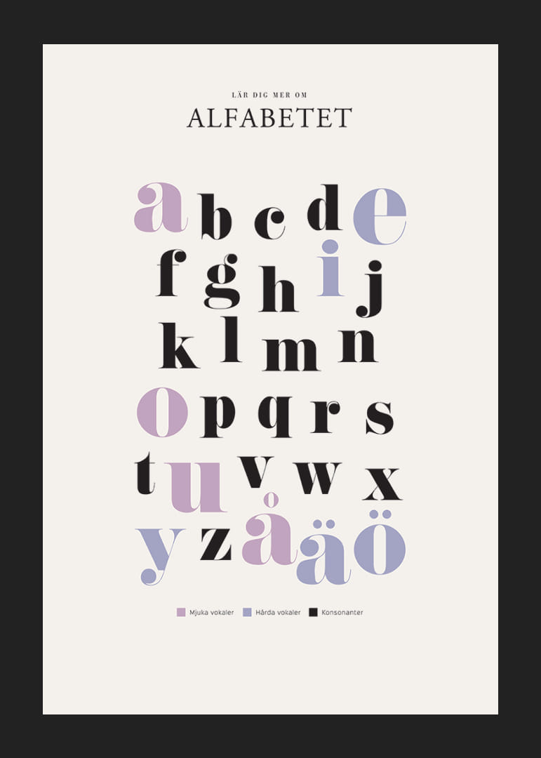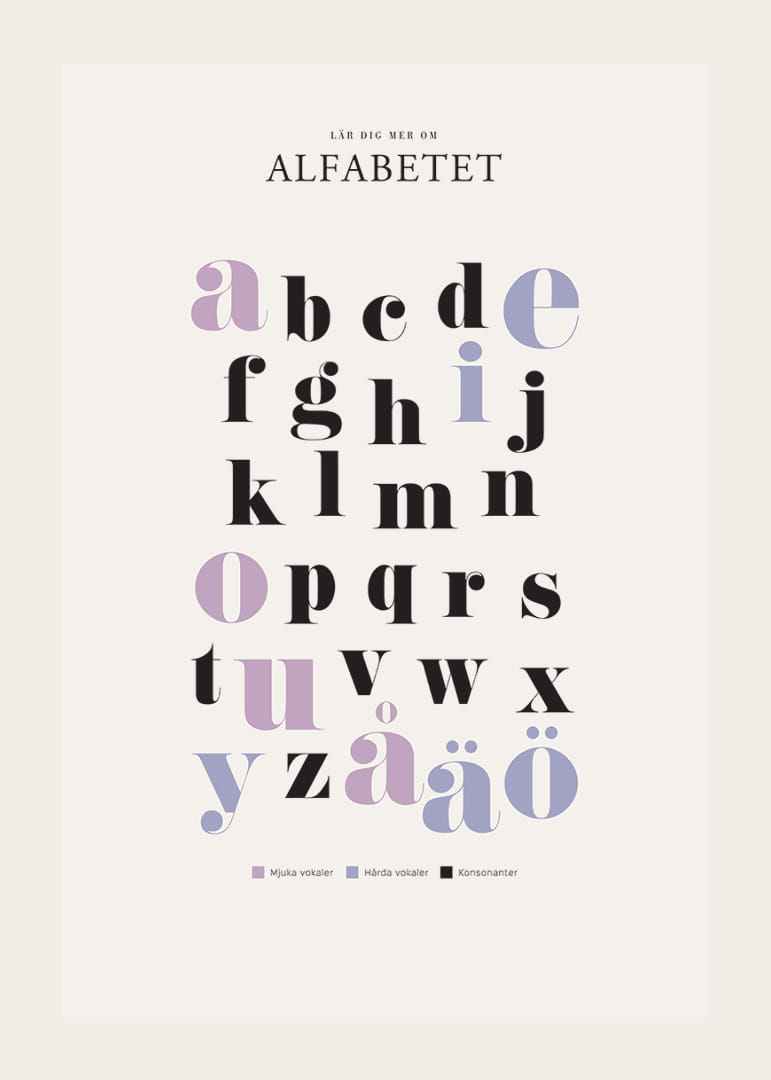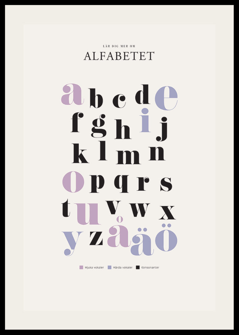 Bokstäverna i alfabetet presenteras i en grafisk och tydlig layout där mjuka vokaler, hårda vokaler och konsonanter skiljs åt med olika färger: lila, blått och svart. Den stilrena affischen ger en pedagogisk överblick och kan bidra till en inspirerande inlärningsmiljö. Postern passar bra i både barnrum och klassrum.