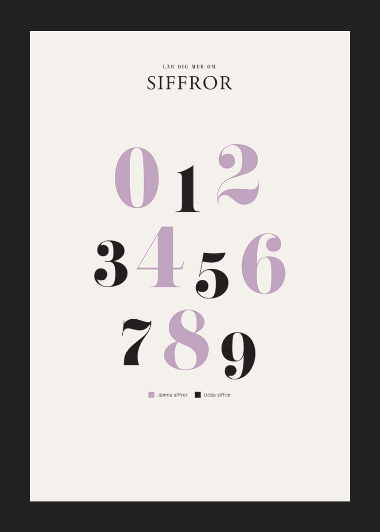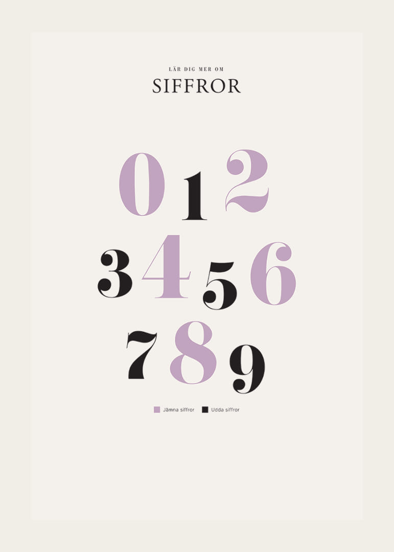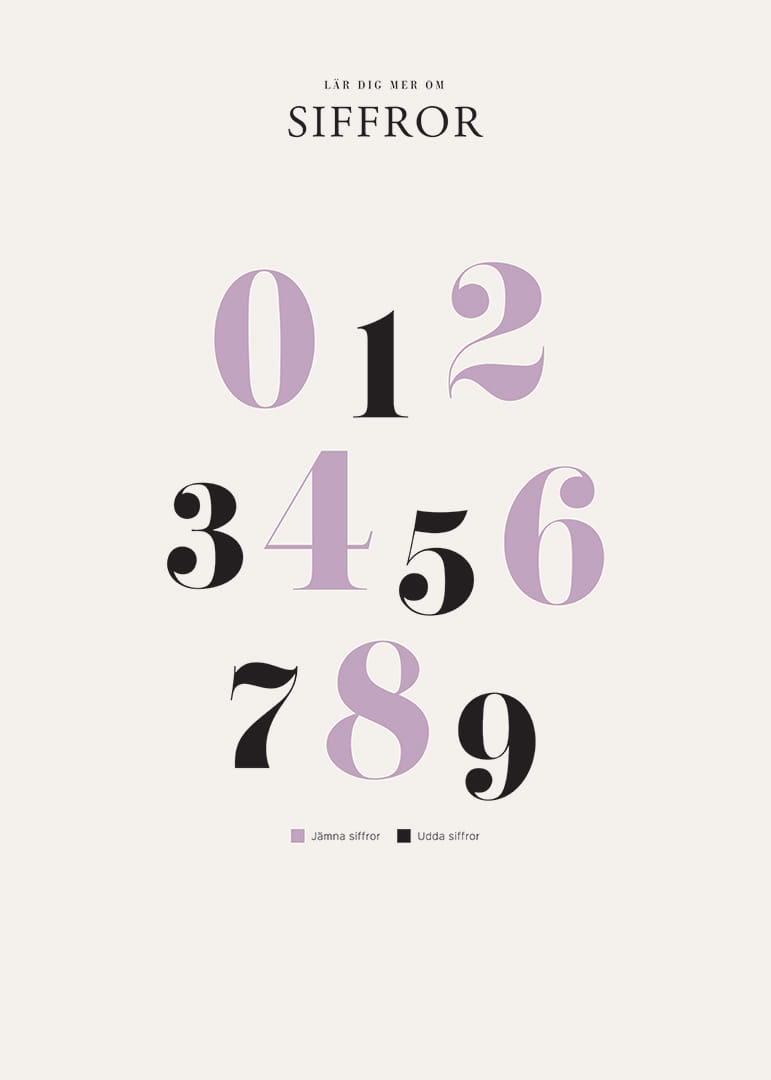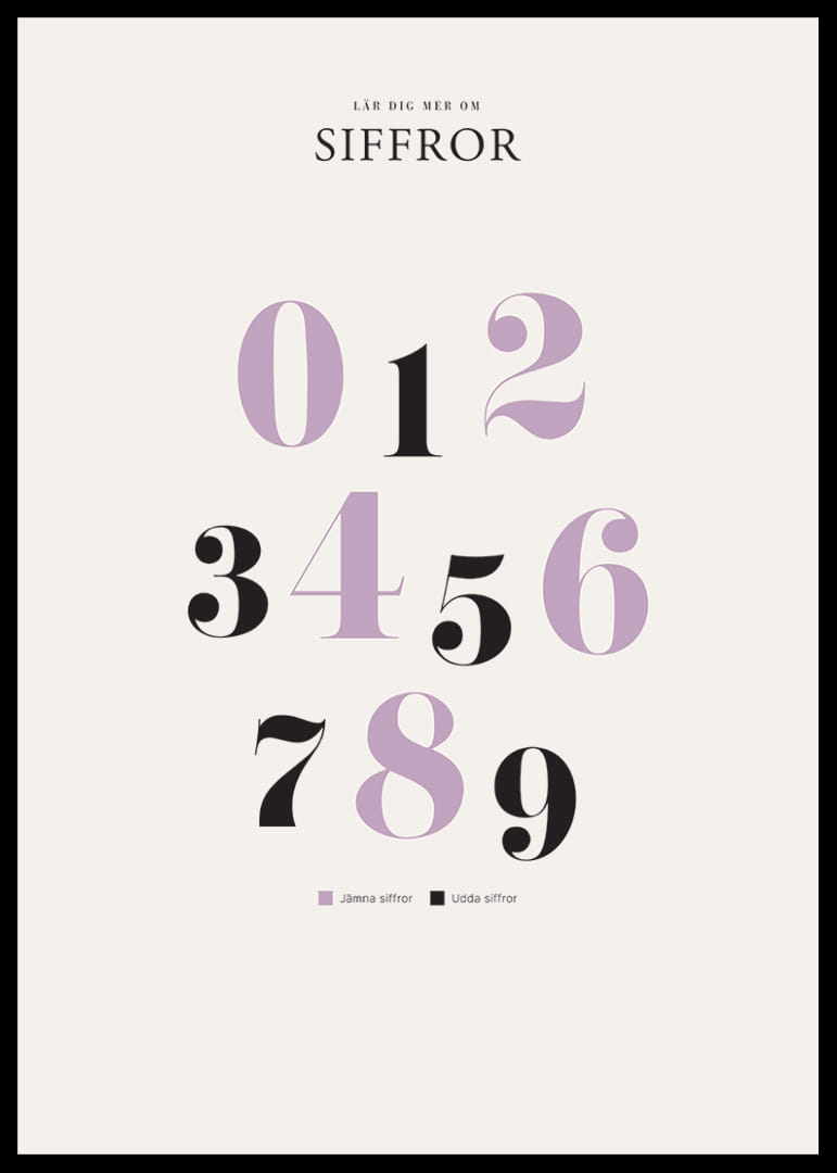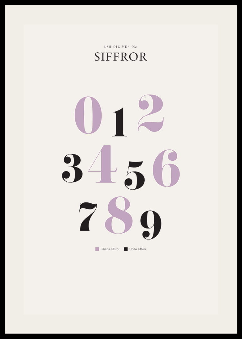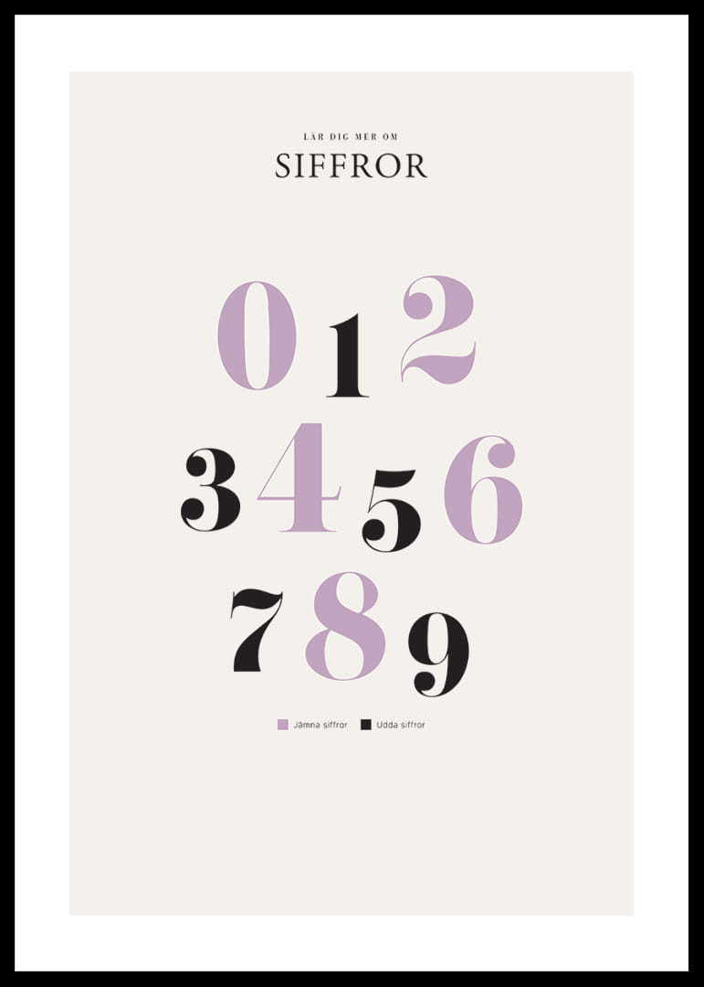 Motivet består av siffrorna 0 till 9 uppställda i tre rader, där jämna siffror visas i ljuslila och udda i svart. Den stilrena typografin och de kontrasterande färgerna skapar en modern känsla. En tydlig liten förklaring om udda och jämna siffror ingår längst ner på postern som passar i barnrum eller lekhörna.