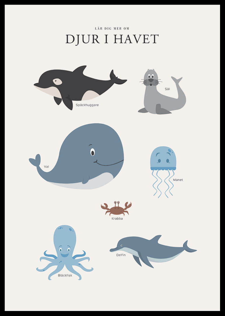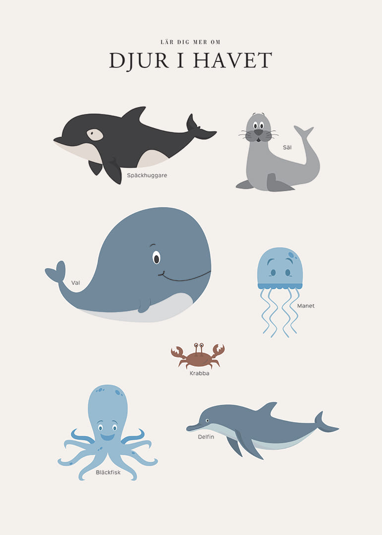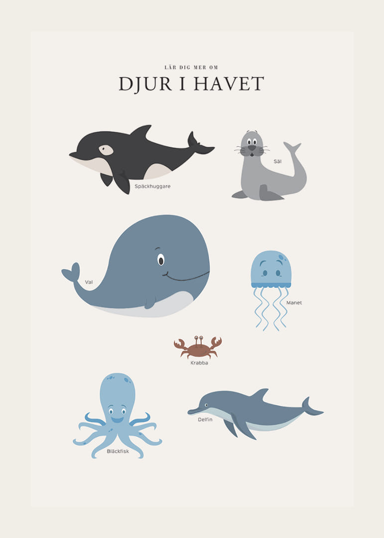 Motivet består av sju illustrerade havsdjur, bland annat späckhuggare, säl, val, manet, krabba, bläckfisk och delfin, samtliga utformade i vänliga färgtoner och med leende uttryck. Denna poster är pedagogisk och passar särskilt bra i barnrum där man vill kombinera lärande med lekfull inredning.