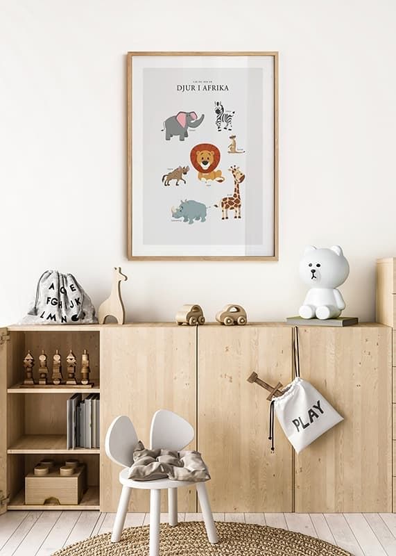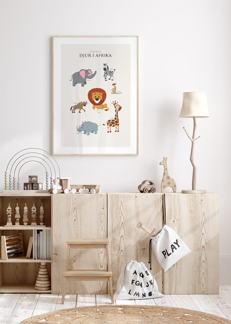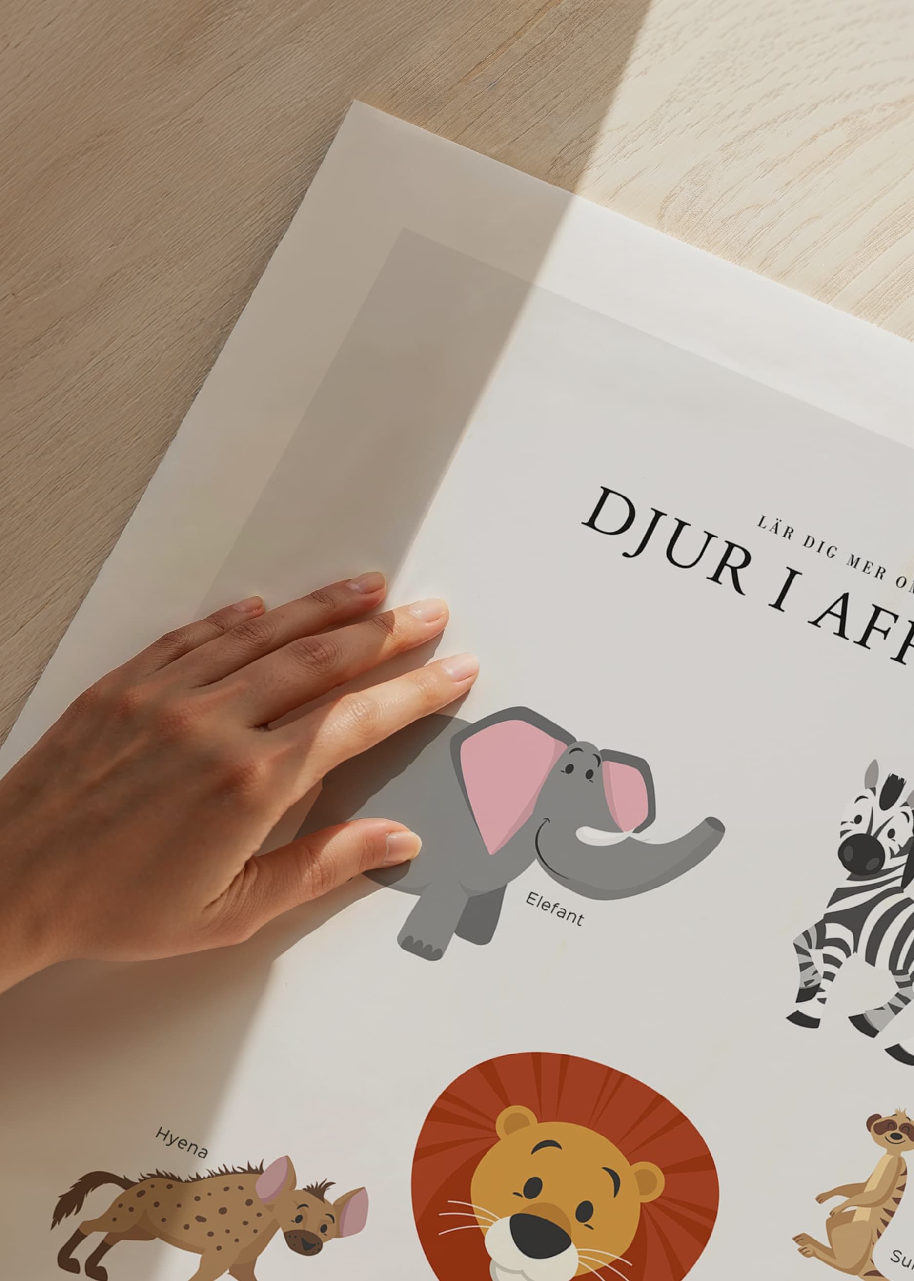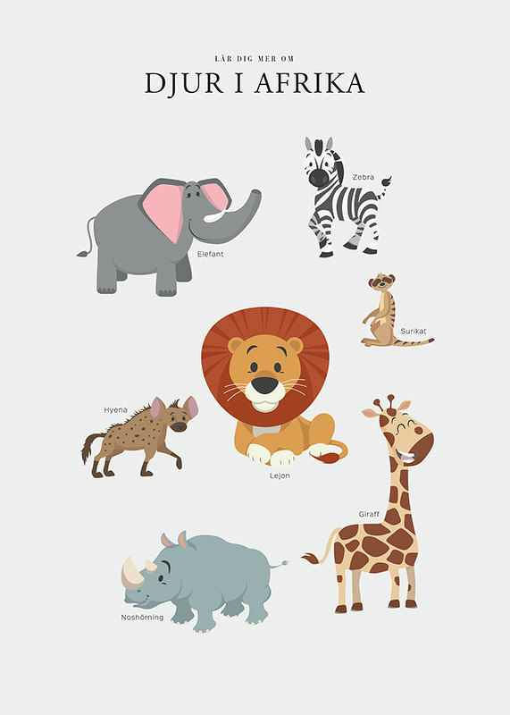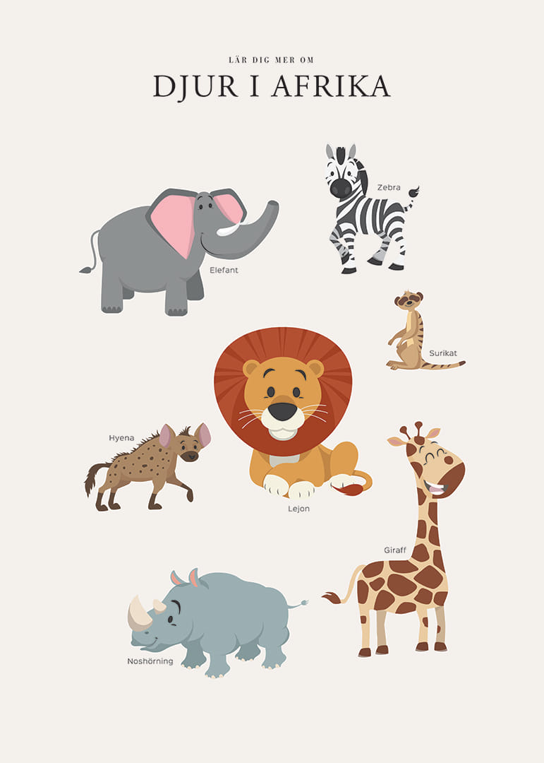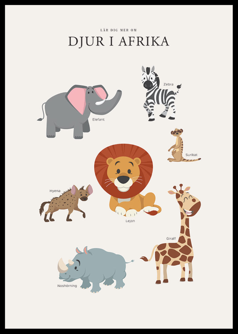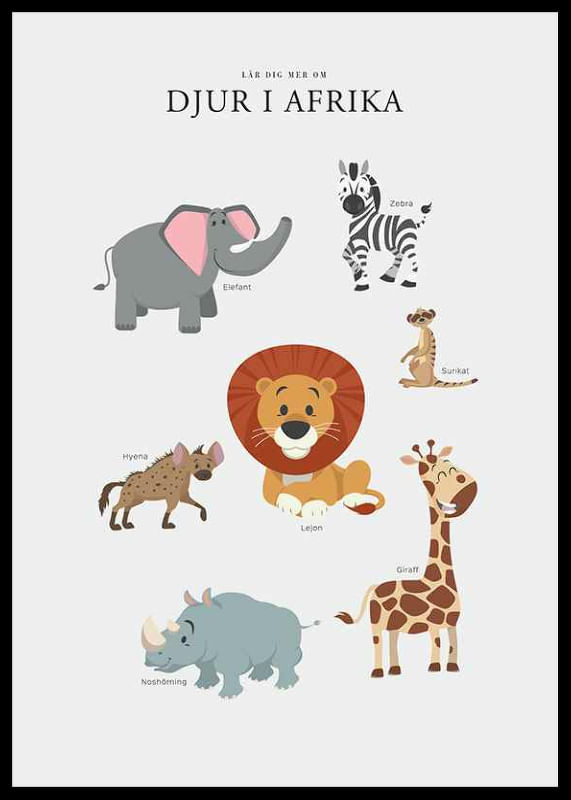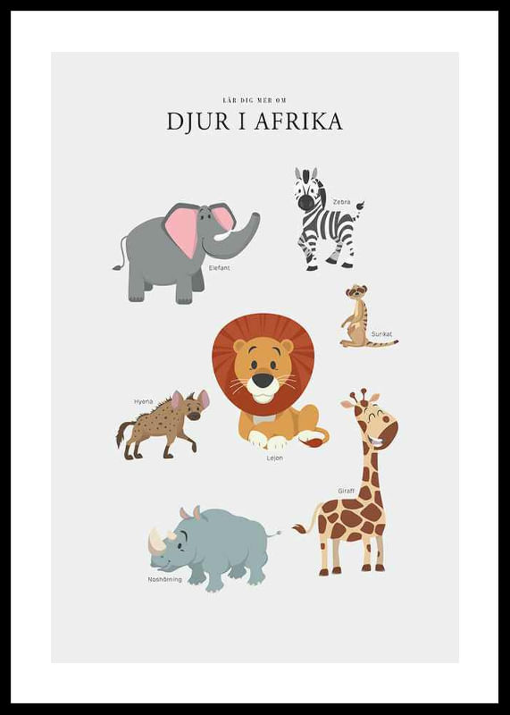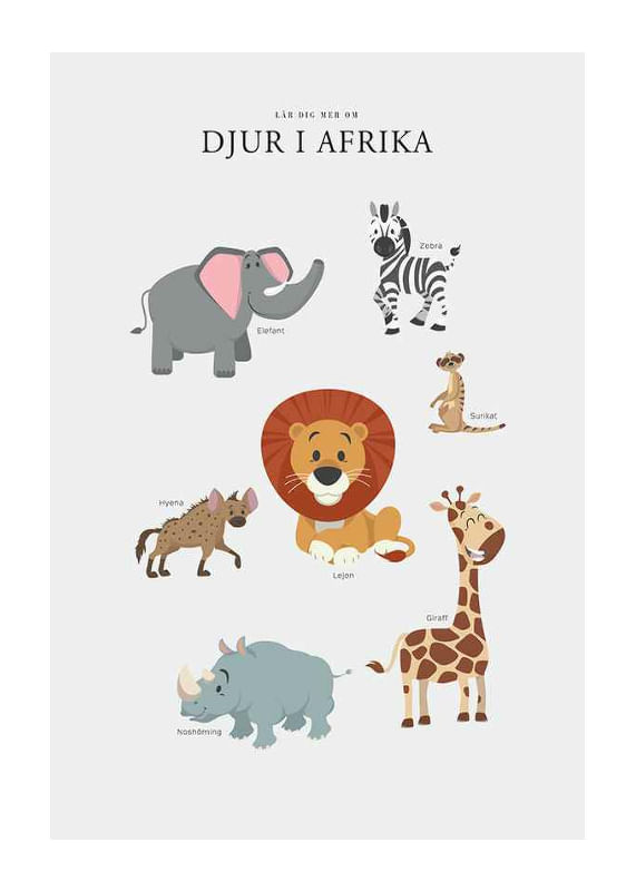 Motivet består av sju illustrerade afrikanska djur, bland annat elefant, zebra, lejon, giraff, noshörning, surikat och hyena. De färgglada djuren har lekfulla uttryck och är placerade mot en ljus bakgrund, med namnen utsatta vid varje figur. Denna poster passar fint i barnrummet och bidrar till nyfikenhet och lärande.