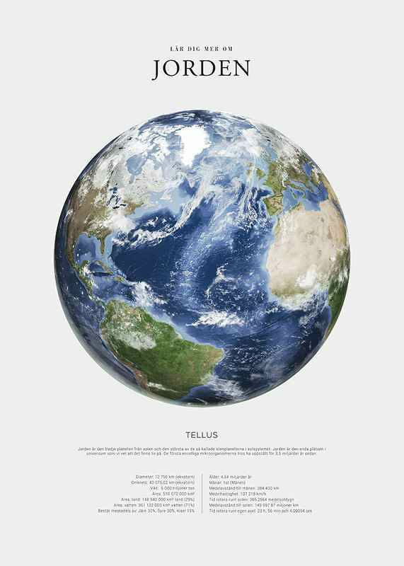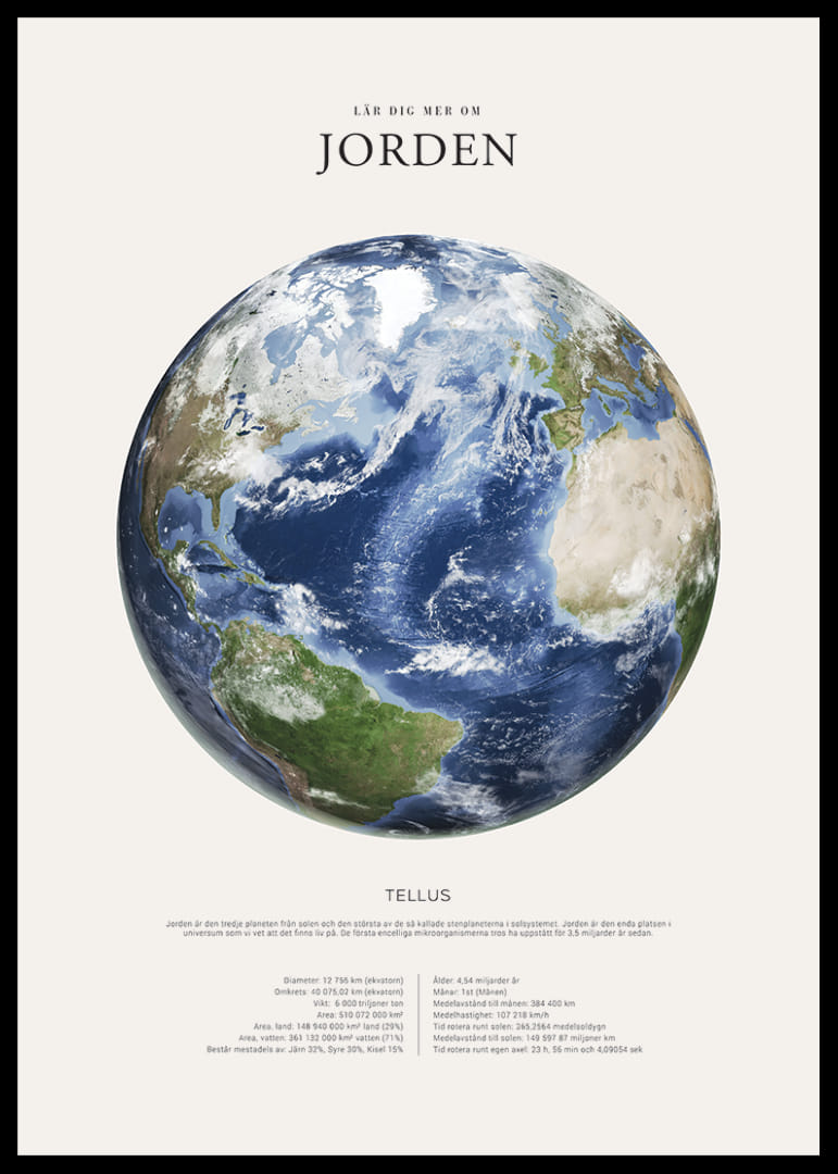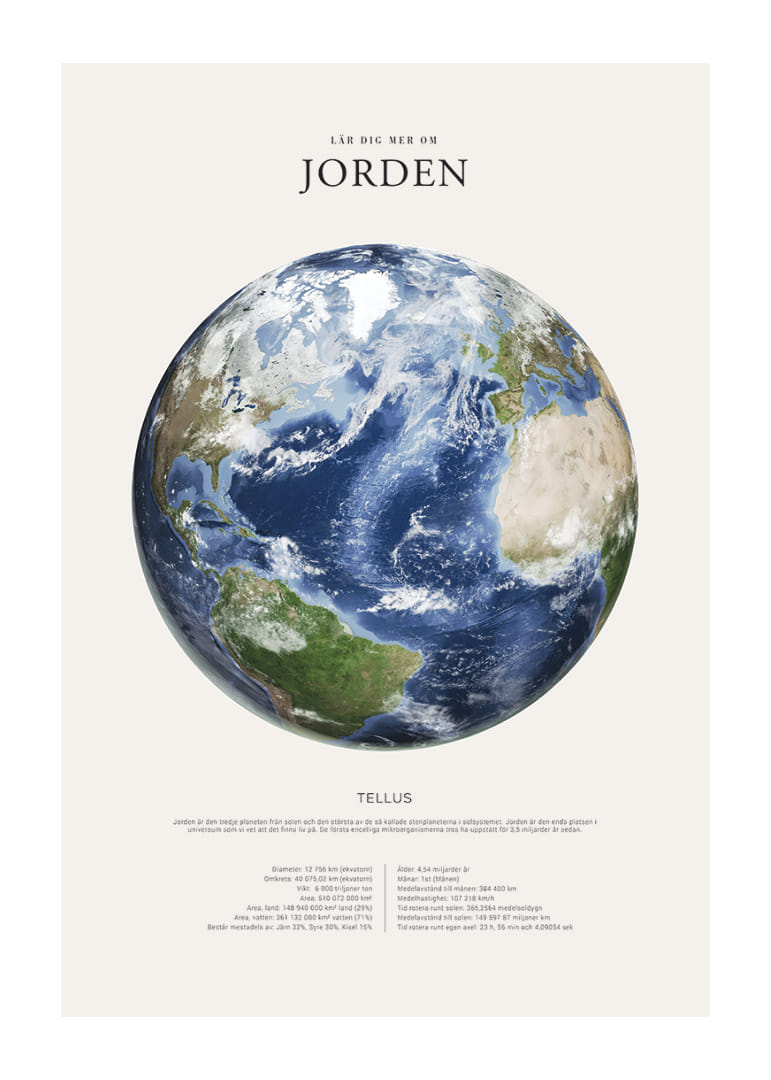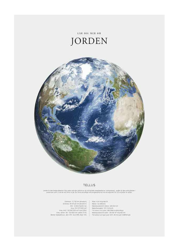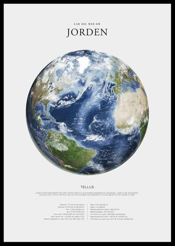 Centrerad jordglob i verklighetstrogna blå, gröna och bruna nyanser mot ljus bakgrund. Ovanför står texten 'Lär dig mer om JORDEN' och under globen presenteras fakta och siffror om Tellus på svenska. En informativ poster som väcker nyfikenhet hos både stora och små och passar lika bra i vardagsrum som barnrum.