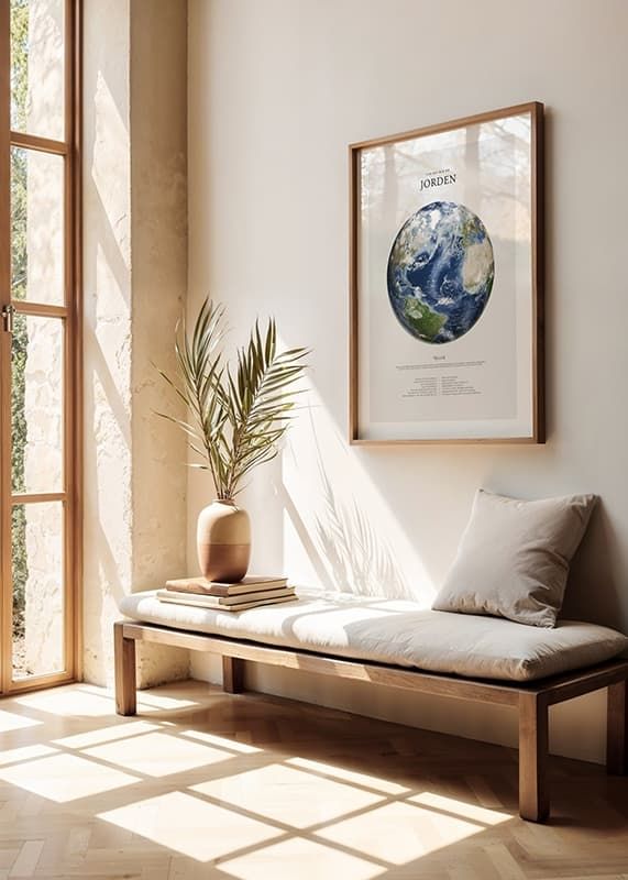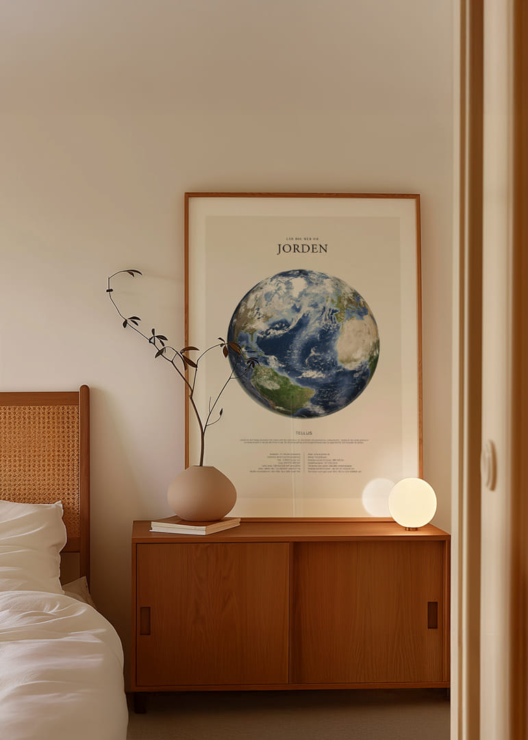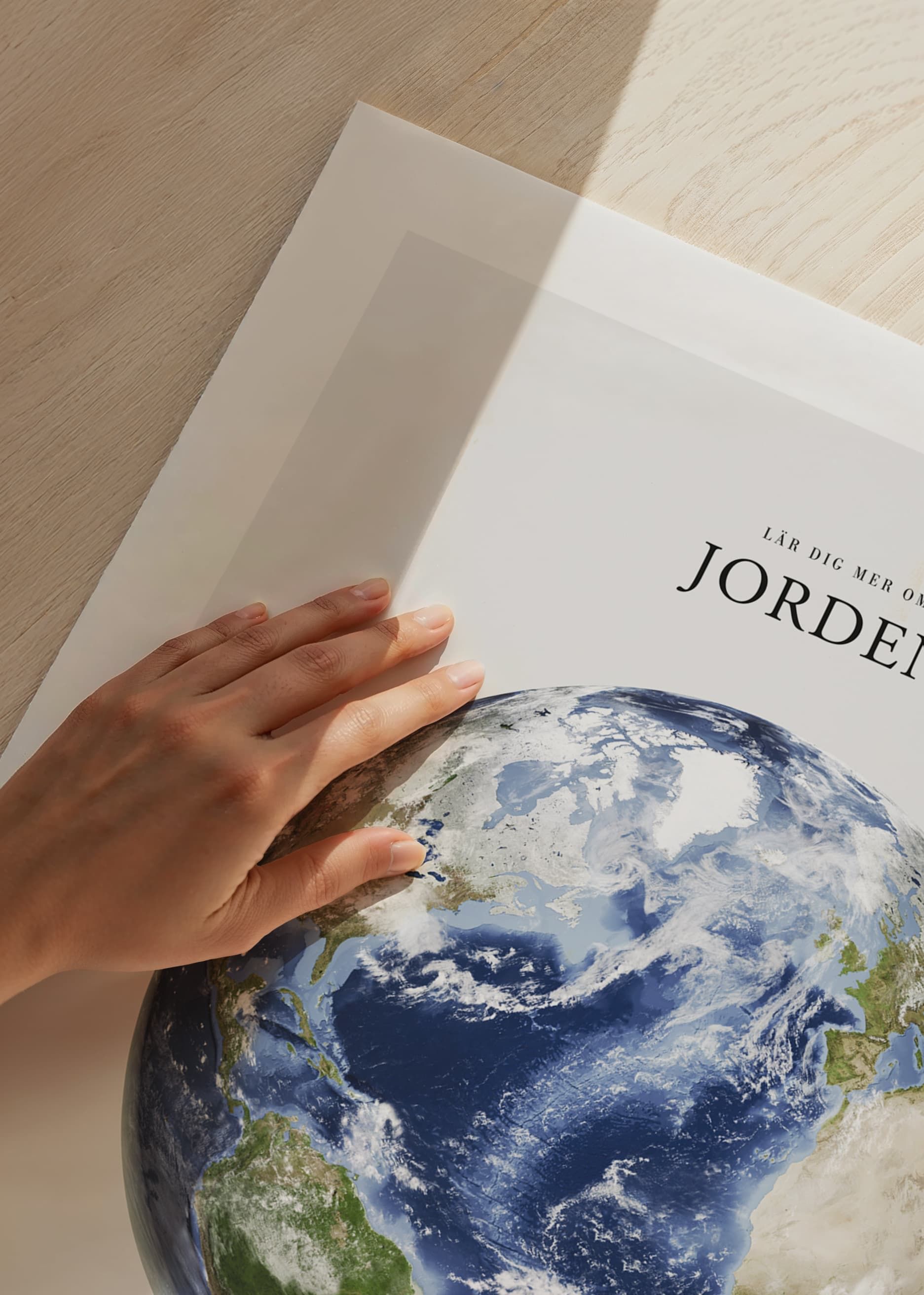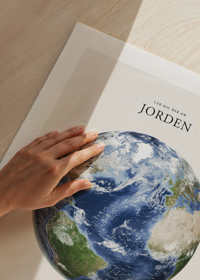 Centrerad jordglob i verklighetstrogna blå, gröna och bruna nyanser mot ljus bakgrund. Ovanför står texten 'Lär dig mer om JORDEN' och under globen presenteras fakta och siffror om Tellus på svenska. En informativ poster som väcker nyfikenhet hos både stora och små och passar lika bra i vardagsrum som barnrum.