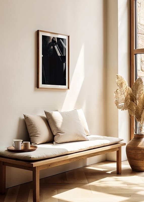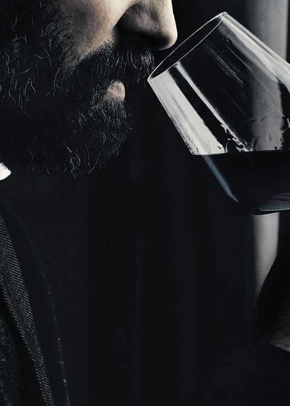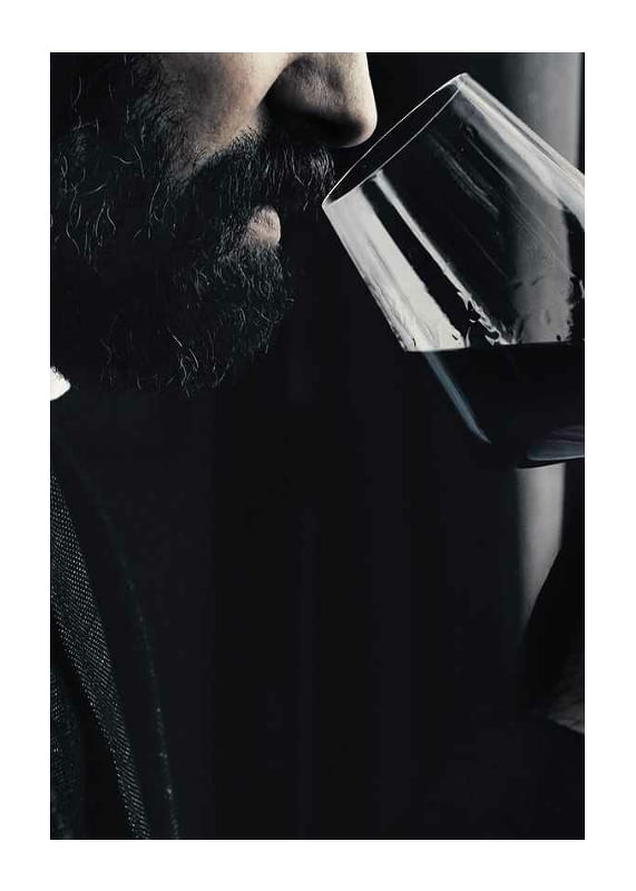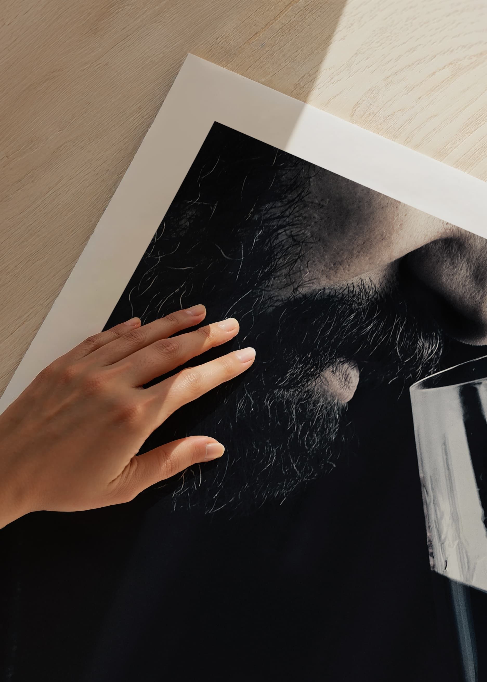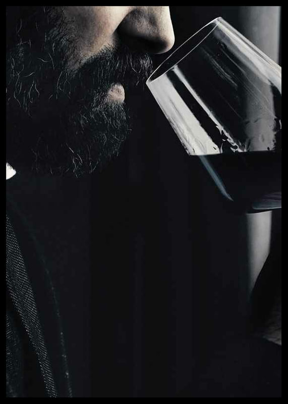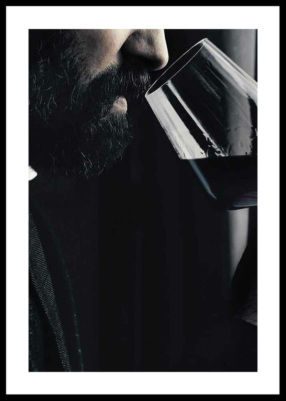 Mörka toner dominerar motivet där en man med markerat skägg doftar på ett glas rödvin. Fokus ligger på ansiktets nedre del och glaset i profil, vilket skapar en stilren och modern känsla. Denna poster passar lika bra i kök som i matsal och bidrar med en sofistikerad atmosfär till inredningen.