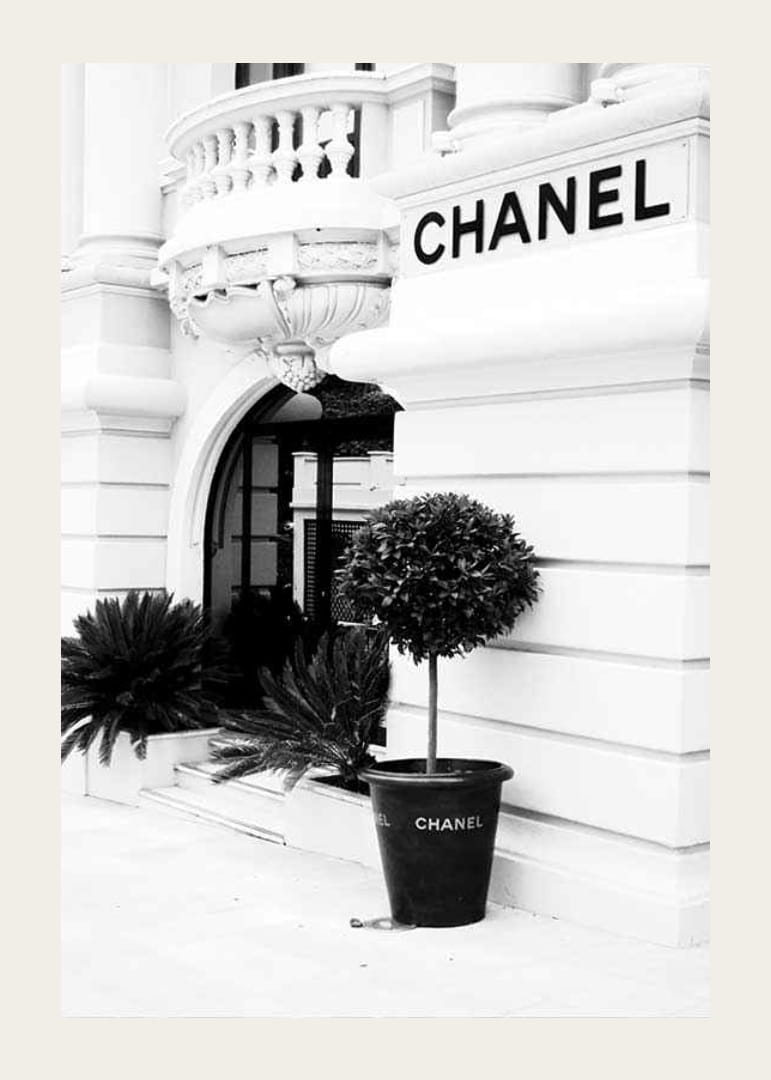 Detaljrik svartvit vy över en Chanelbutiks eleganta fasad med bågformad entré, dekorativa pelare och symmetrisk balkong. Gröna växter i stora krukor med Chanel-logotyp placeras längs den ljusa byggnadens utsida. Denna poster passar i inredningar där stilren modekänsla önskas.