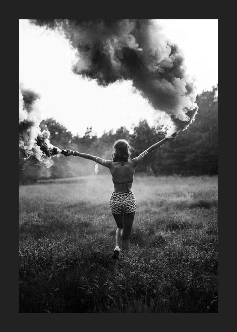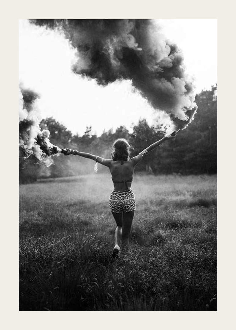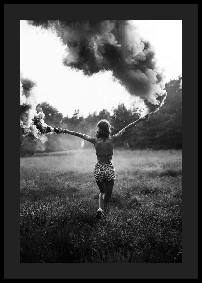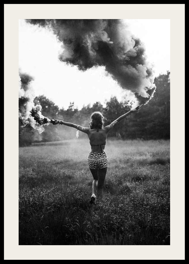 En kvinna står med ryggen mot kameran, armarna utsträckta och håller två rökfacklor som skapar täta rökmoln runt henne. Det svartvita fotot är taget i naturmiljö med högt gräs och skog i bakgrunden, vilket ger motivet en känsla av rörelse och energi. Postern passar i både vardagsrum och kreativa miljöer.