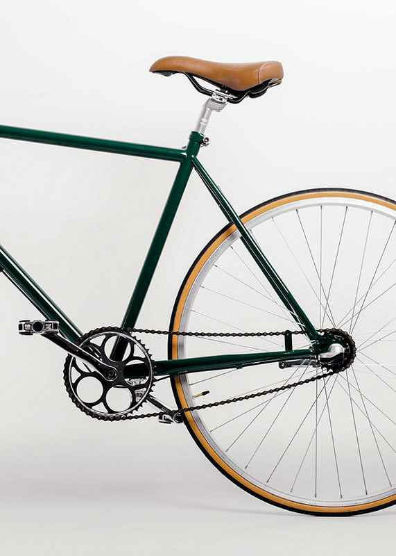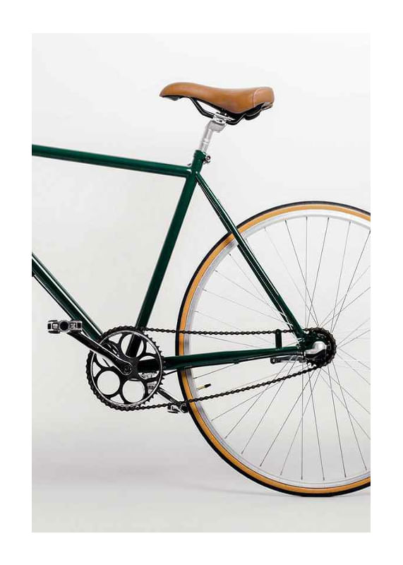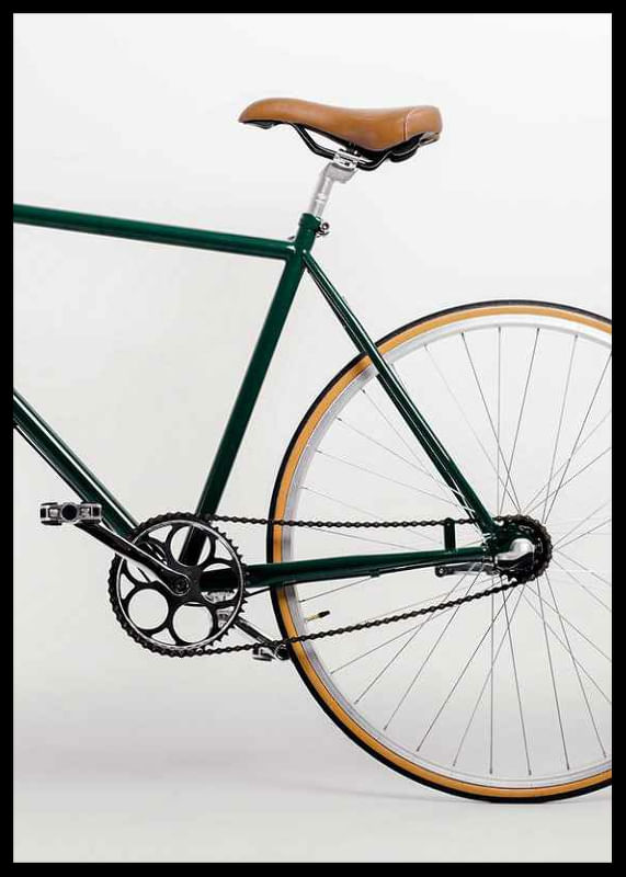 Närbild av bakre delen på en klassisk grön cykel med smal ram och brun sadel. Motivet fokuserar på bakhjulet, kedjan och pedalen mot en enkel, ljus bakgrund. Tydliga linjer och neutrala färger ger en stilren känsla som passar i hall, arbetsrum eller vardagsrum. Denna poster förmedlar sommarkänsla och rörelse.