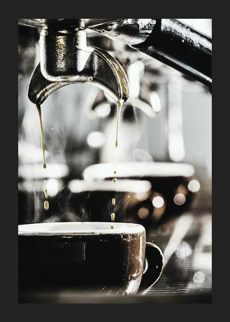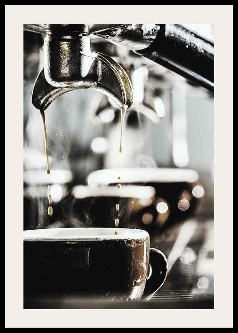 Kaffedroppar faller ner i en mörk kopp under en metallisk espressomaskin. Motivets närbild fångar ånga och reflektioner, med mjuka, suddiga former i bakgrunden. Neutrala toner i brunt, svart och silver skapar en modern känsla. En poster som adderar vardagsrealism och värme till kök eller hemmakontor.
